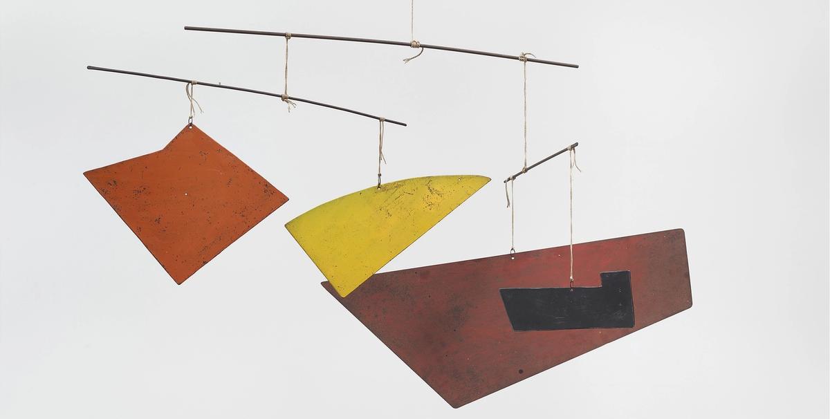 The work, made from three rods that are repurposed from former sculptures, is a sister work to The Clangor (1941) mobile, which got its name from Calder’s description of “three heavy plates that gave off quite a clangor”. It isn’t widely know that Calder was close friends with the French-born composer Edgard Varèse—known as the “godfather of electronic music and one of the first to produce noise music”, Rue says. “They were like brothers.” Varèse’s Ionisation (1929-31), a six-minute composition that was one of the first pieces to be performed in a concert hall by percussionists alone, and Calder’s first hanging mobiles were produced around the same time, Rue notes. Including Clangors in the show “summons a delightful history of blurred ideas exchanged between visual artists and composers”, he says.