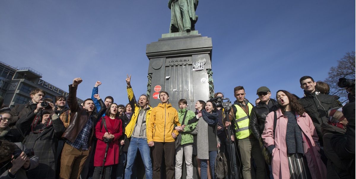 Russian authorities have hit on a novel solution for preventing anti-corruption protests. Or just maybe, an iconic monument to Alexander Pushkin, Russia’s most important 19th century poet, really was in dire need of a touchup. Either way, the monument in Pushkin Square, created by the sculptor Alexander Opekushin and unveiled in 1880, was barricaded off on 27 March and shut down until September. That was just one day after it served as the focal point of the largest of dozens of anti-corruption rallies organised across Russia that resulted in over 1,000 arrests in Moscow alone. The Interfax news agency reported that restoration of the monument had started in July 2016 and was supposed to be completed by the end of last year. As it turns out, Moscow has a history of barricading monuments to poets to prevent public gatherings. Triumfalnaya Square, the site of a towering monument to the 20th century Russian and Soviet poet Vladimir Mayakovsky, was shut down in 2010-13 for an archaeological dig and reconstruction, once again soon after it was used as the site of opposition demonstrations.