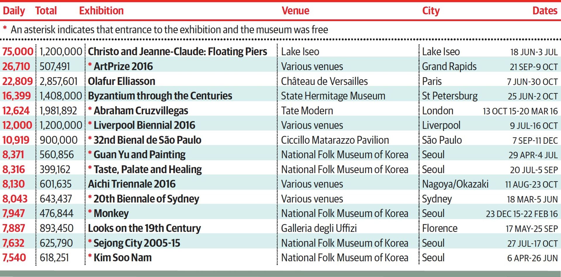 In second place this year, dropping down from the top spot it has held in the previous two surveys, is the annual ArtPrize taking place across Grand Rapids, with 26,710 visitors a day. Notable mention must also go to the single venue Bienal de São Paulo. It attracted 10,919 visitors a day despite—or perhaps because of—its wholehearted embrace of the theme of uncertainty, even handing over the catering to one of the artists. Speaking to The Art Newspaper before the event, the curator Jochen Volz confessed: “We know that this might go wrong.” It certainly went wrong in the right way.