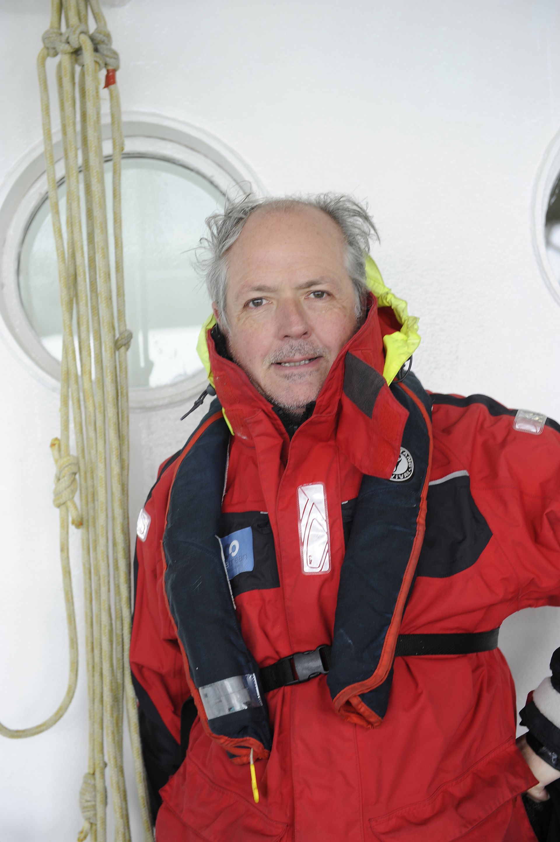 Told me of Chilean Patagonia, tiny huts in mountains where you arrive exhausted and they ask for your passport; he is developing digital DNA inscription so one can carry ID with one everywhere on phone. Revealed I have never owned a mobile phone, let alone smart thing, and he asked my age, like him 52, asked to take my portrait, “I need you for my next presentation — the man who never had phone and so can never be hacked!” Assured him I have a landline at home, bakelite. Photographed with wind whipping, spray breaking under the solid beams of three searchlights, fog dancing light paths. With his Chinese wife has three young children who speak Russian, two Chinese dialects, English, French, “we have a whole family of spies but cannot say which country they will spy for.” His offices in London are in Mission Impossible V with his own staff in the background. One bright white seagull lit in beam, “we are getting closer to land.” Totally dramatic as a movie, in spray and deep fog with Seymour Hoffman, a Surrealist spy story in churning Polar waters. Happy to crash to bed refreshed and drenched before midnight. Dread to imagine state of bar right now.