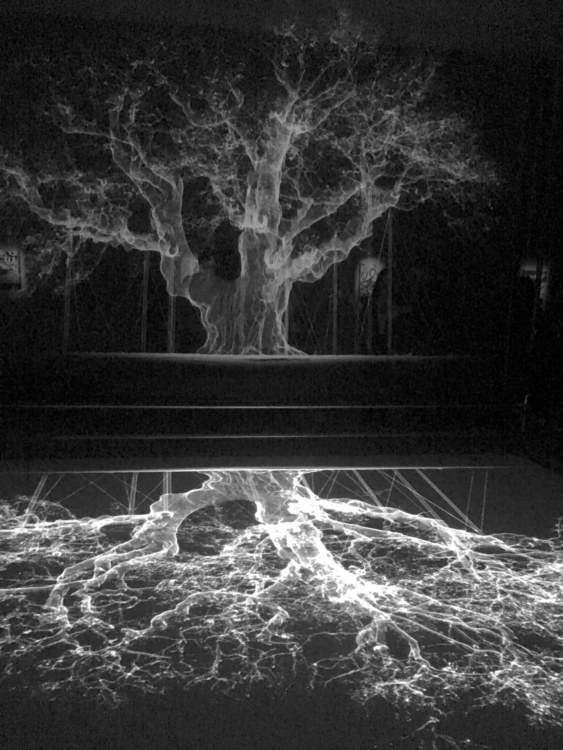 Arguably attracting just as much attention, was another new installation featuring a giant projected image of the Major Oak, a 1000-year-old oak tree in the centre of Nottingham’s Sherwood Forest that, according to local folklore, sheltered Robin Hood and his Merry Men. What is arguably the most famous tree in Britain has, since the Victorian times, been propped up by an elaborate series of crutches, chains and supports. In Collishaw’s semi-transparent, slowly rotating spectral incarnation it looks especially sickly, crippled and on its last legs.