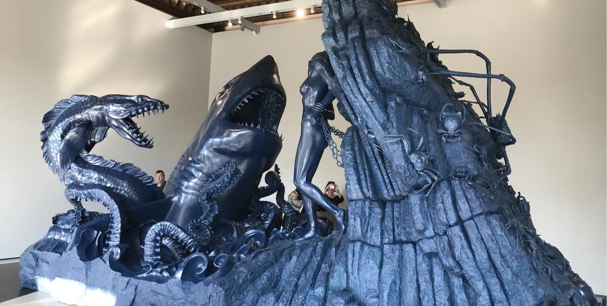 At Palazzo Grassi, another unlikely pairing is Andromeda, the princess of Greek mythology, who Hirst depicts chained to a rock cowering from the sea beast sent to kill her by the sea god Poseidon. Hirst has added in a second monster, a giant shark lunging for Andromeda mouth agape, recalling the artist’s famous tiger shark preserved in formaldehyde as well as Steven Spielberg’s Jaws.