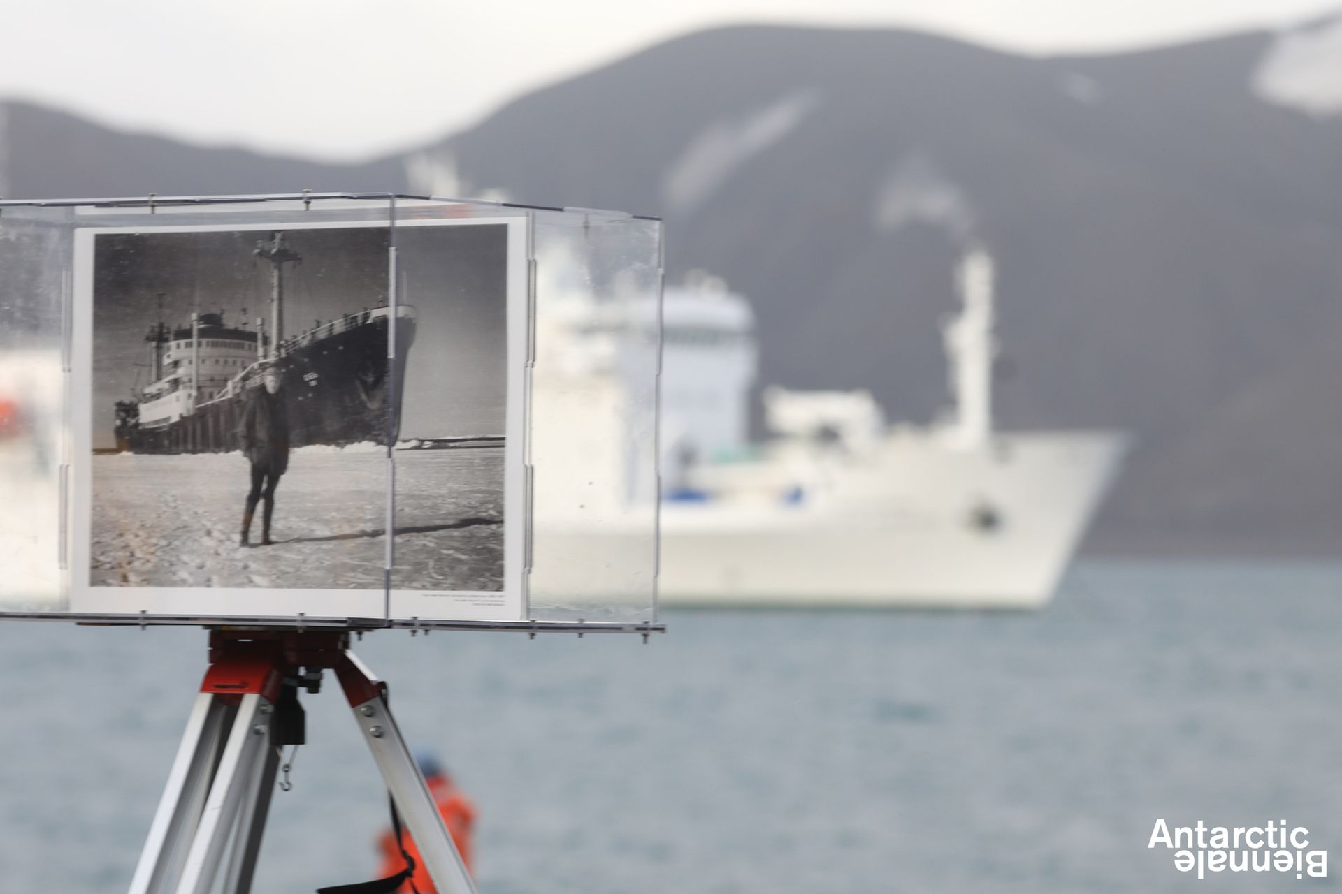 Typical barren beach; Joaquin Fargas putting reflective silver sheets over the rocks to try and help stop global warming whilst the young architect Gustav Düsing was busy with his white cotton tent, sprayed with water to freeze rock-solid like salt or Greek marble drapes. Revelatory that back in Berlin he was able to freeze it successfully at night whilst here it is just not cold enough, and if you can’t freeze a sheet in the Antarctic where can you? He is not allowed to stay on shore through the night when it might work. Indeed the first actual sun rays touching upon myself since standing outside Buenos Aires airport. Rather effective photo exhibition using special plastic display boxes on tripods mounted in the water and along the beach, the horizon line in a photograph next to actual horizon on the sea.