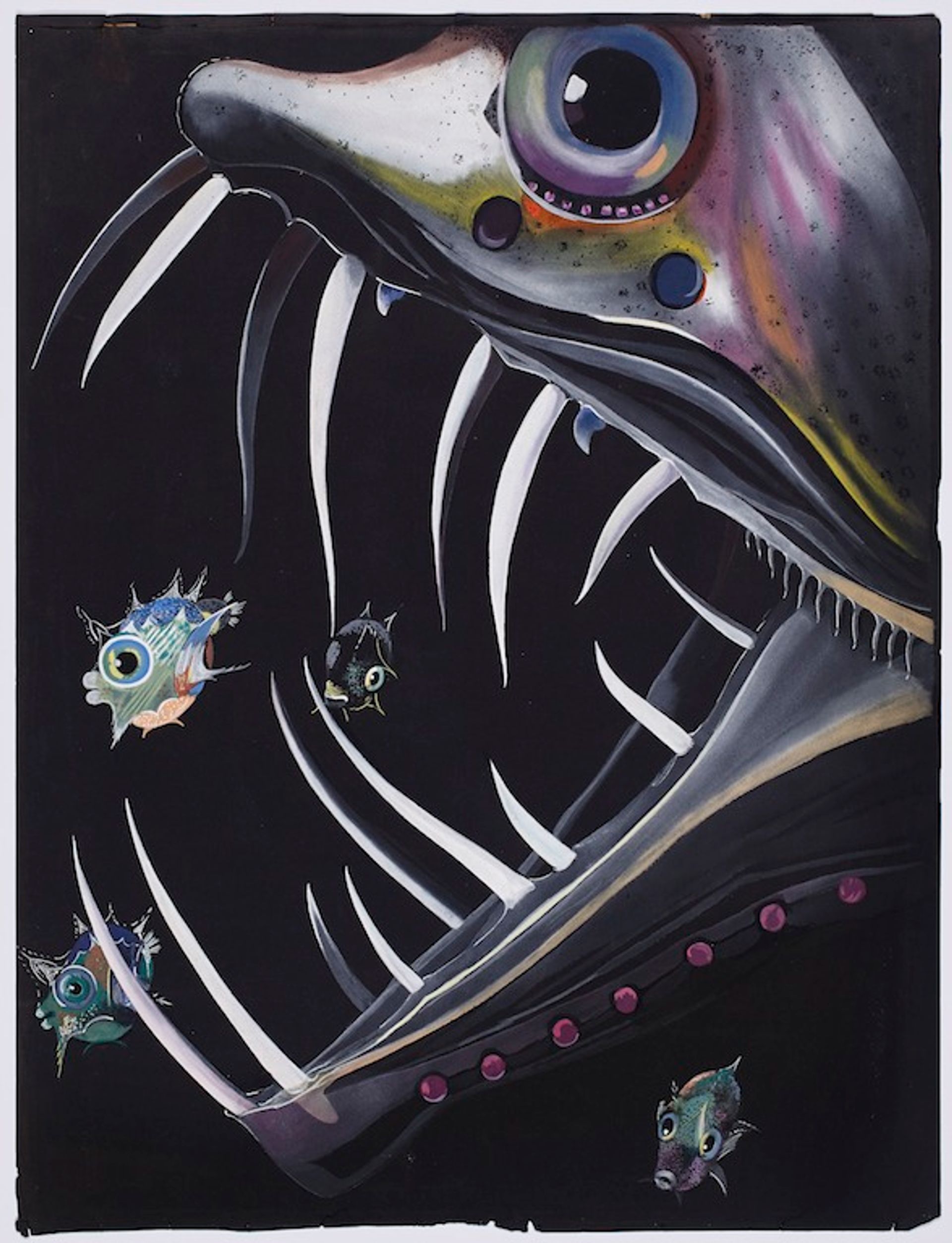 Else Bostelmann’s watercolours of bioluminescent deep-sea creatures on dark paper (with titles like Big Bad Wolves of an Abyssal Chamber of Horrors) are particularly fascinating. She drew them from the observations of Beebe and Otis Baron, who in 1934 descended into the ocean in a metal bubble, 3,000 feet off Bermuda—the deepest humans had ever dived at the time. (The pair described what they were seeing in real time through a telephone line to the ship above.) One watercolour, Bathysphaera intacta Circling the Bathysphere (1934) shows Beebe’s face peering through a porthole as two large, red fish swim around it.