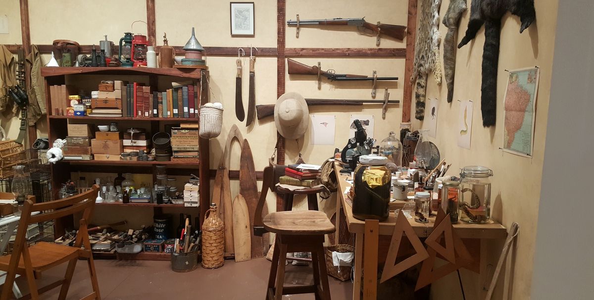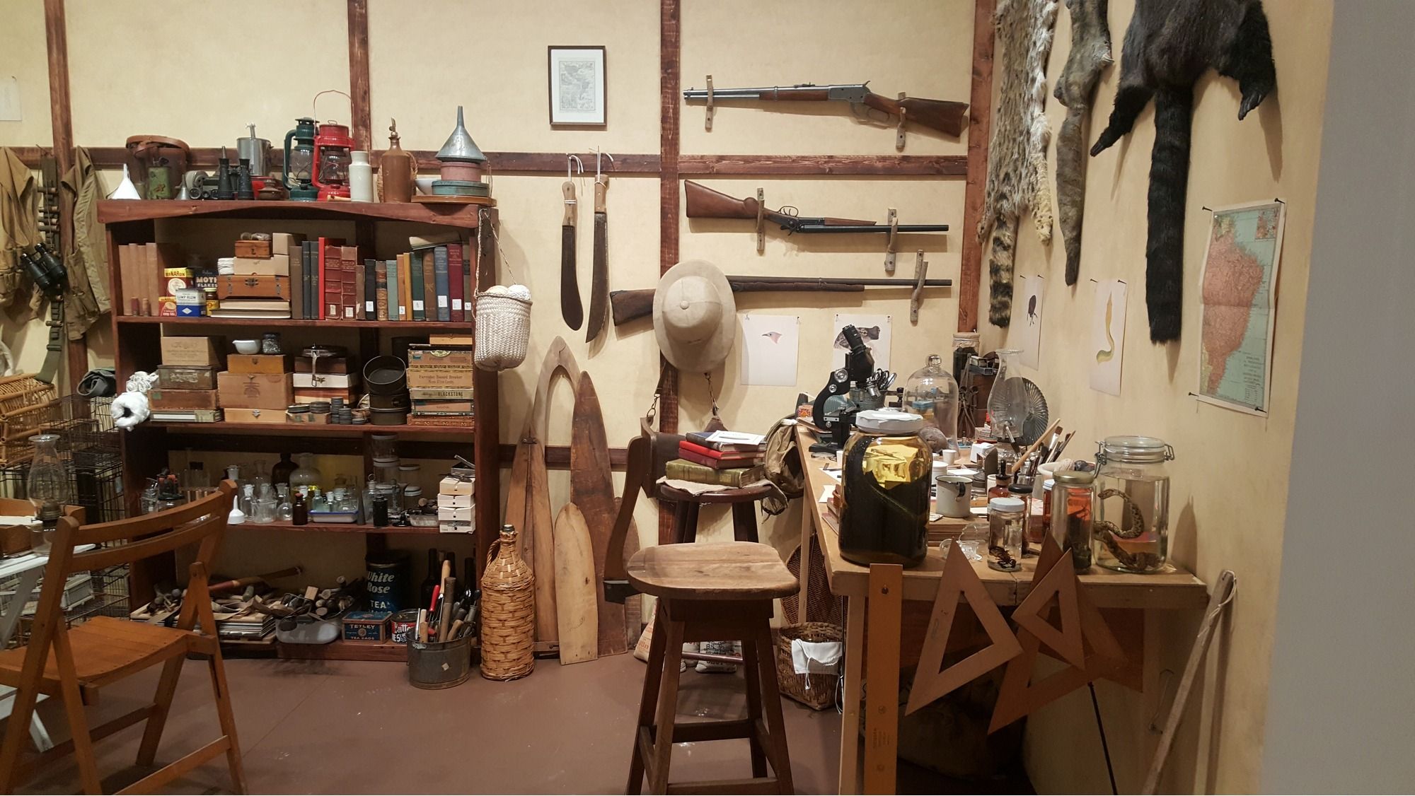 Though Dion calls the watercolour drawings “the real stars of the show”, he has also created two engaging works for the exhibition: large installations, positioned side-by-side, that reimagine the group’s laboratories aboard a research ship and in the jungle (The Department of Tropical Research—Jungle Station and The Department of Tropical Research—Oceanographic Laboratory, 2017)—where artists and scientists, women and men, worked side-by-side. Most of the objects in the installations—such as period furnishings, lamps and scientific equipment—belong to the artist. “I’m my own prop house,” he says.