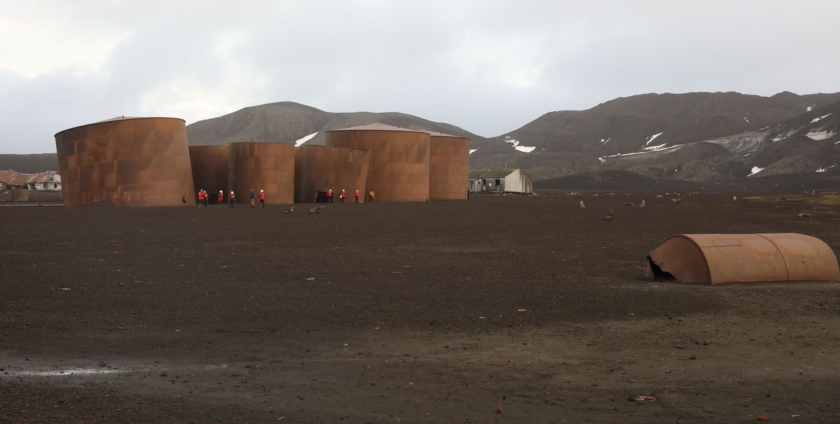Saturday 25th March: Blurred tannoy at brutal 6.30 and staggered out on deck, wind blowing strong and wondrous vision of our approach to Deception Island, the sun breaking out from behind us lighting ancient the red rocks like Uluru, and through into the volcanic bay beyond. Magical dawn light and this sheltered cove. But the sun vanished as we embarked onto this desolate stretch of black volcanic beach, ‘Whales Bay’; old metal brown tanks for whale oil, collapsed buildings, decaying corrugated iron, perfect subject for any gloomy British 1950s abstractionist, drab colours, jagged and black and cold. Filled with mean seals jousting and battling and ready to attack. So inhospitable, the nastiest place we have been ashore, indeed one of nastiest places I have ever been, such bad karma from mass-slaughter, sulphur stink, stained black by the sins of the giant murders that systematically took place here. The giant Richard Serra rusted tanks, spooky, and collapsed wooden buildings, should really be called ‘Desolation’ Island. It started as whaling station in 1911 and all the bleached carcasses of boats, wood like ancient fossil buried in the sand. The whole bay is an active volcano since 1800, in 1967 a full explosion drove out the British base, they came back but in 1969 it blew again. The lava covered grave of one A.H. Farrant, God how lonely a place to be buried.