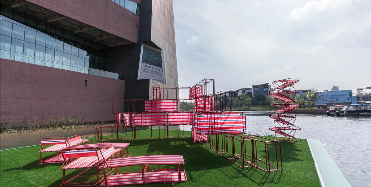 The opening group show of mostly new commissions represents how A4 plans to “not just show art that is just painting, new media, or connected to Chengdu, but all three, with a mixture of Chinese and international contemporary art”, says the assistant curator Li Jie. Highlights of the eclectic exhibition include Secret of Streets—Chengdu (2017), by the Chongqing-based duo Noffice (Wei Haoyan and Zhu Ye), which replicates the familiar but fading-into-nostalgia trappings of a government office, and the Hong Kong artist Tim Li’s unfolding the possible X (2017), consisting of collapsible beds made from the canvas bags used by Chinese migrant workers, installed on a raft on the lake.