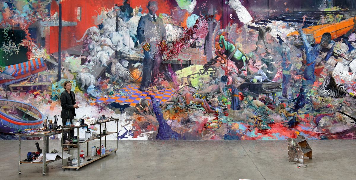 Inside Jonas Burgert’s studio, in the Berlin suburb of Weissensee, an enormous painting is approaching completion. At a panoramic 22 metres wide, the work called Zeitlaich is a fantastical frieze of nightmarish visions, grotesque figures and apparently random objects, tumbling together in a surreal dreamscape, rendered in Burgert’s characteristic palette of rich, dark tones clashing with violent graffiti-like outbursts of neon and fluorescence.