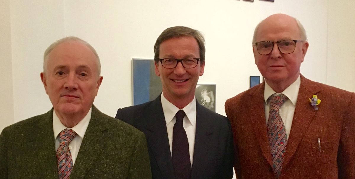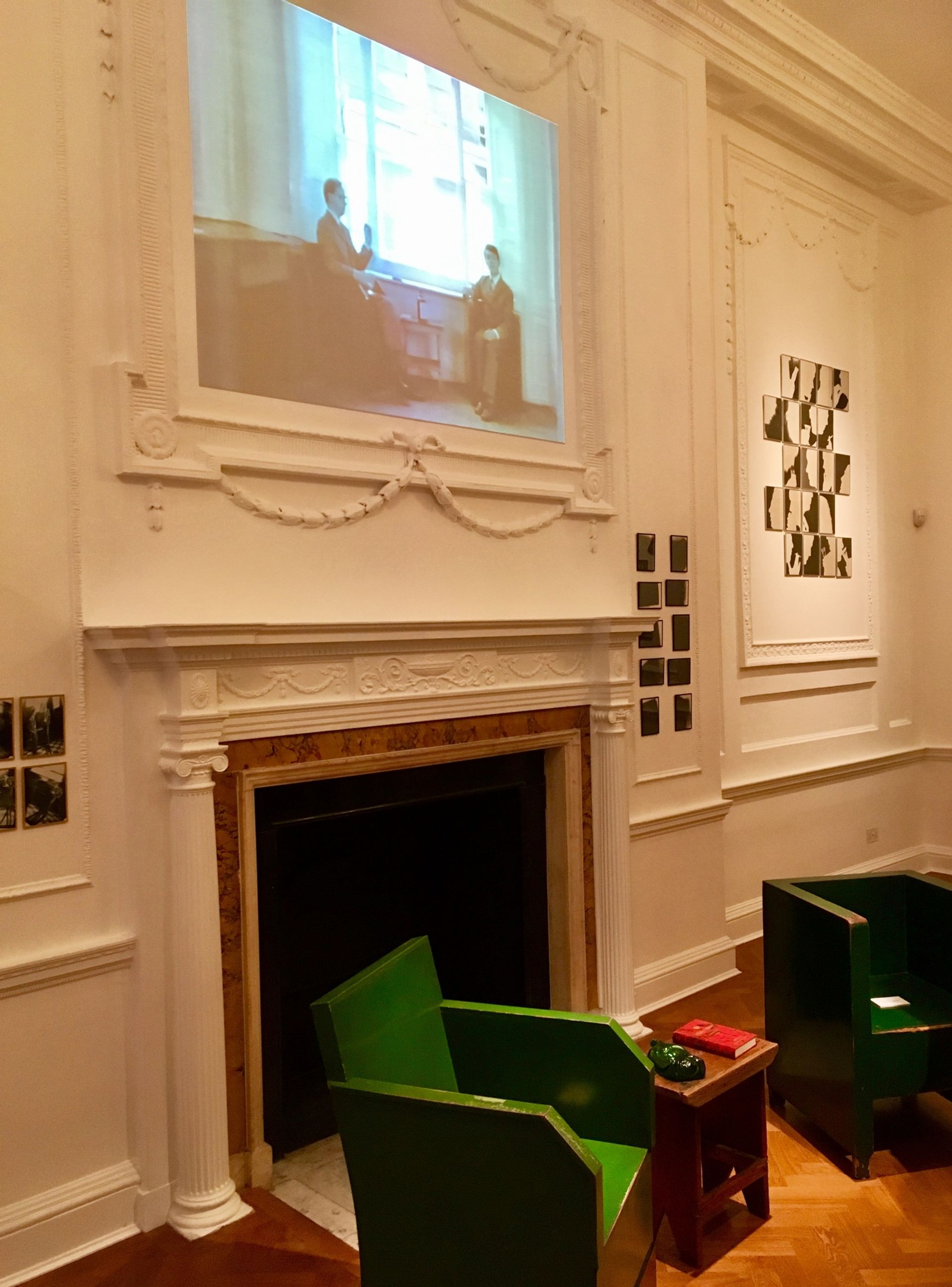 There was more artistic noise emanating from the front gallery where, among the elaborate 18th-century mouldings, Gilbert & George were conjuring up spirits of a different kind with their 1970s photographic Drinking Pieces, which depict the couple in various states of inebriation. These were joined by a trio of Video Sculptures in which a youthful G&G smoke, drink and stroll to the sounds of Grieg and Elgar as well as birdsong and thunder. Presiding over their earlier drunken incarnations, today’s decidedly more sober G&G revealed that the two rather battered green chairs positioned by the fireplace (along with an empty bottles of Gordon’s gin) were the very same ones used in the 1972 video Gordon’s Makes Us Drunk, which was playing above the mantelpiece. “They were the only two chairs that we owned at the time,” Gilbert informed me, whilst also stating that they were most emphatically not for sale. “We still want them back at home,” he said.
