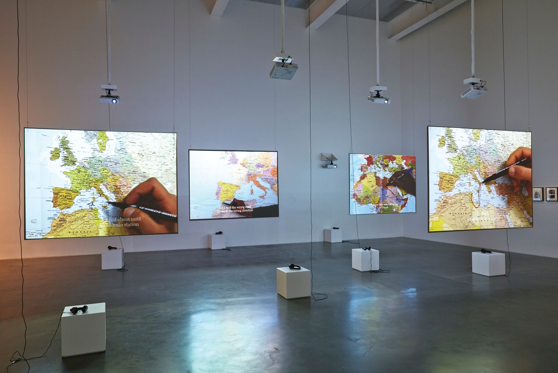 "In the exhibition catalogue I speak of a certain type of “sentimental documentary” or “lyrical reportage”. One example could be the first-person narrative of Bouchra Khalili’s beautiful piece in which eight individuals tell the stories of their travels, mainly from Africa into Europe. They do so by drawing the map of their journey. We hear the stories individually, not as a mass. The typical journalistic narrative of this exodus usually depicts migration from point A to B, from Algeria to Lampedusa. What touched and shocked me from this chronicle is how the journey can last two, three, four, five years even. In a sense, it’s a constant state of migration."