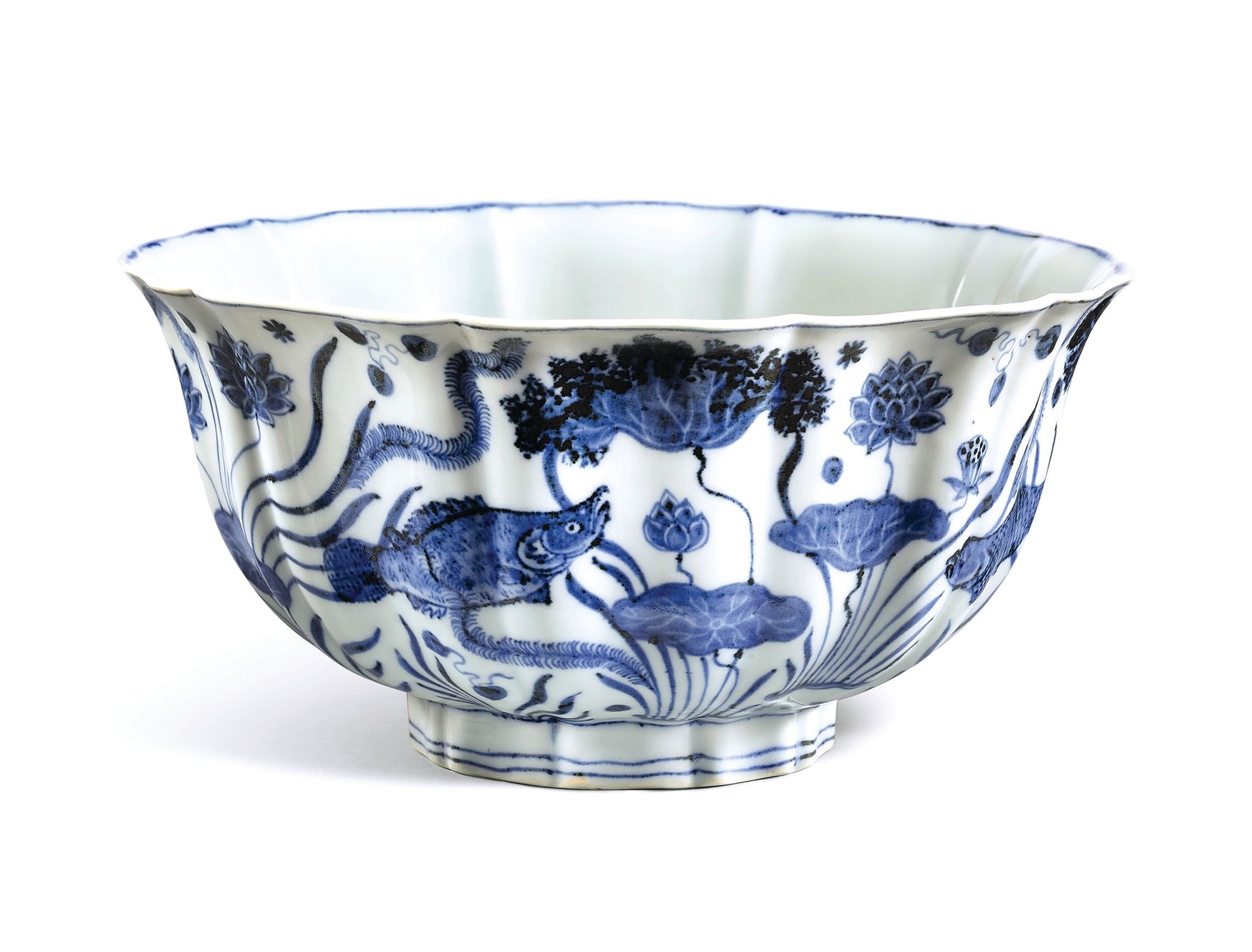Offered in a single-lot sale during Sotheby’s Hong Kong auction week, this lobed bowl achieved the second-highest price for a Ming porcelain at auction. The 23cm in diameter artefact, made of underglaze blue porcelain, has an exterior design of carp and mandarin fish swimming in a pond of lotus flowers and seaweed. Although the bowl, hailing from a private Japanese collection, has been published extensively—thanks to the unique confluence of painting quality, shape and size—it only surfaced on the market for the first time last month. Just two comparable examples are known to exist, both of which are smaller and preserved in the National Palace Museum in Taipei.