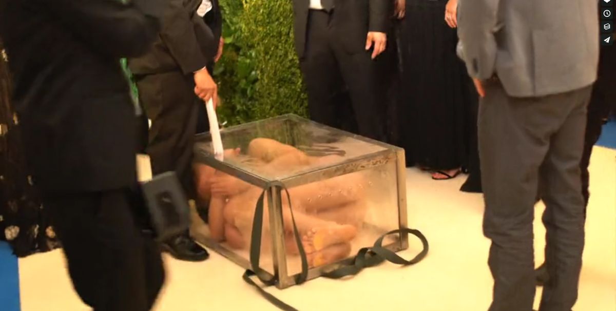 A naked Russian performance artist had himself encased in a transparent plastic box and dropped on the steps of the Metropolitan Museum last night while celebrities arrived on the red carpet for the Costume Institute’s annual gala. He was arrested by polices and is facing charges of public lewdness, obstructing governmental administration, criminal trespass and disorderly conduct, according to the New York Daily News.
