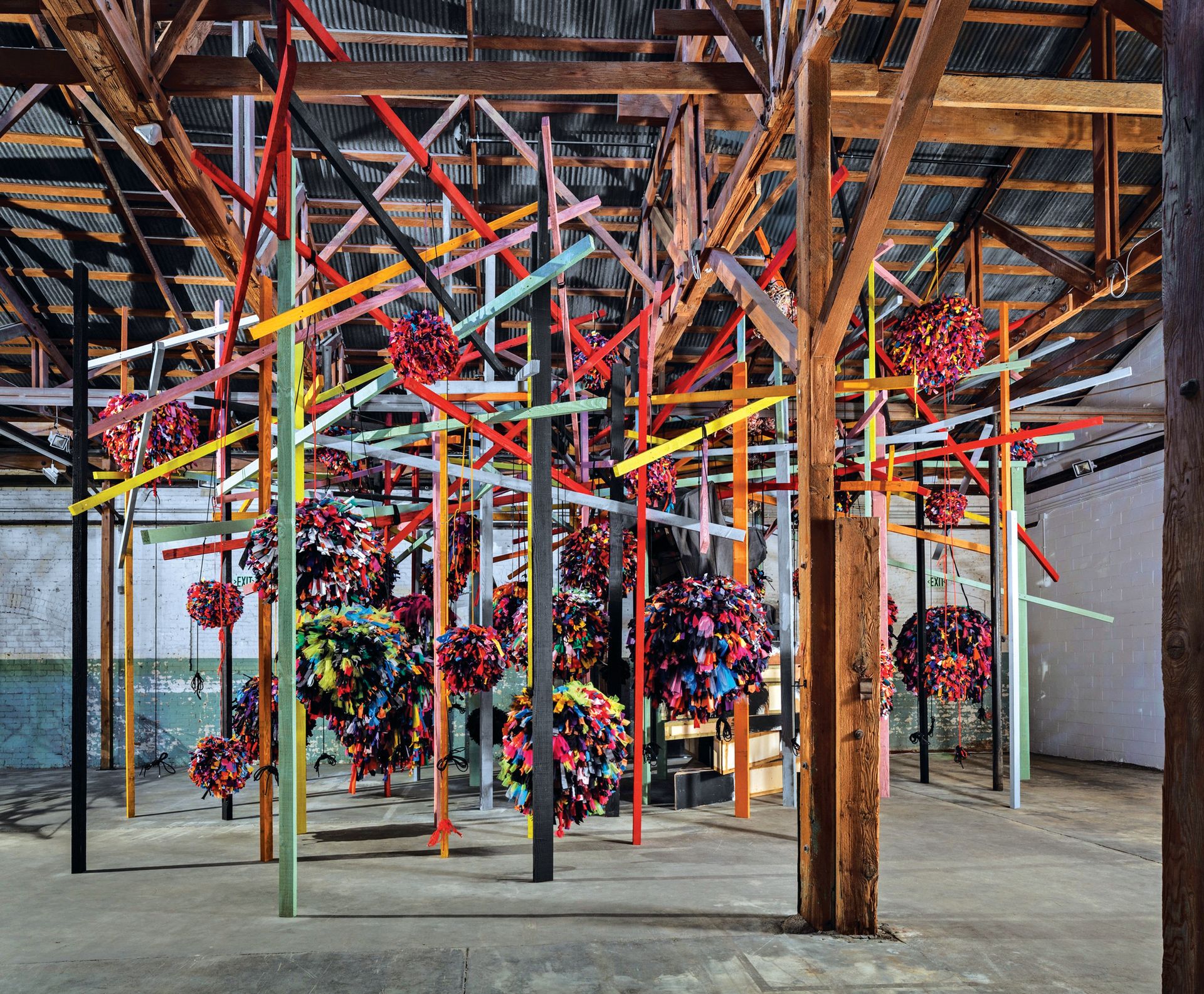 Phyllida Barlow works on a monumental scale using the most unmonumental of materials. Her giant, often precarious-looking sculptures are constructed from everyday stuff—cardboard and concrete, plastic sheeting and wooden offcuts, gaffer tape and polystyrene—which is vigorously manipulated and often vividly painted to form energetic, rumbustious environments. This septuagenarian dynamo has long been respected among British artists, many of whom—including Martin Creed and Rachel Whiteread—she taught during her 40 years as a tutor and then professor at the Slade School of Art in London. However, Barlow’s wider international profile coincided with her retirement from teaching in 2009 and her representation by Hauser & Wirth a year or so later. Since then, she has barely stopped. The British pavilion is just the latest in a long line of solo shows—the New Museum in New York, the Norton Museum in Palm Beach, and Tate Britain’s Duveen Commission to name but a few.
