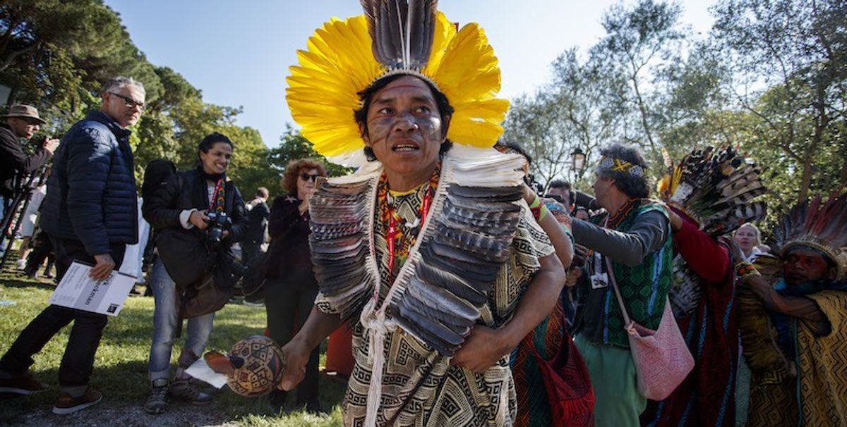 At the Arsenale, there is more of the same. The Brazilian artist Ernesto Neto’s possibly well-intentioned but deeply self-serving Sacred Place consists of a soaring jute and cotton tent which encloses a space decorated with plants, with woodchips strewn on the ground, and full of cushions for visitors to sit on. This is intended to replicate the structure of the Cupixawa, a ceremonial meeting place for the Huni Kuin Indians living in the state of Acre in the Amazonian forest. In tents such as these, they meet to drink ayahuasca, a plant-based hallucinogenic substance, which apparently enables them to connect with nature and “heal the wounds of a sick modern society”. (It is also incidentally the new favourite recreational substance of the organic hipster set.) Lest we fail to appreciate that Neto has personally engaged with this community, he has some actual Huni Kuin Indians to hand, complete with feathered ceremonial headdresses, to drive the point home. In a performance at the exhibition opening, they sit under the tent while Neto talks and then talks some more. If this project is about giving the Huni Kuin a voice, why is it the artist doing most of the talking?