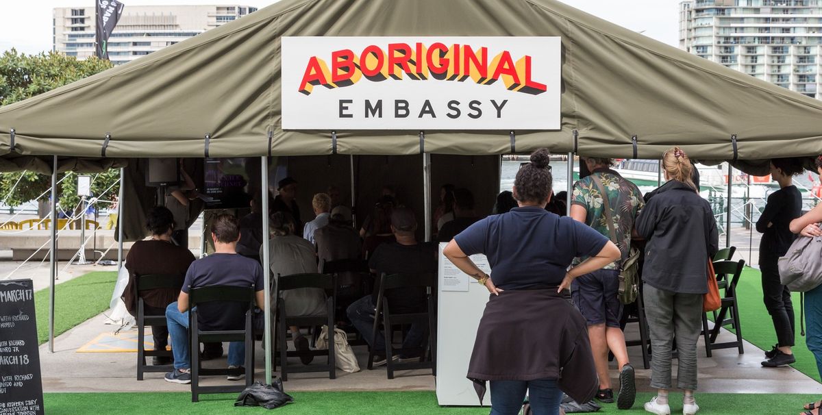 The new joint acquisitions include three paintings by Johnson (Seat of Power, 2016; Bad Debt, 2016; and A Feast of Reason and a Flow of Soul, 2016), an installation by Richard Bell (Embassy, 2013-ongoing) and a video by Peter Kennedy made in collaboration with John Hughes (On Sacred Land, 1983-84).