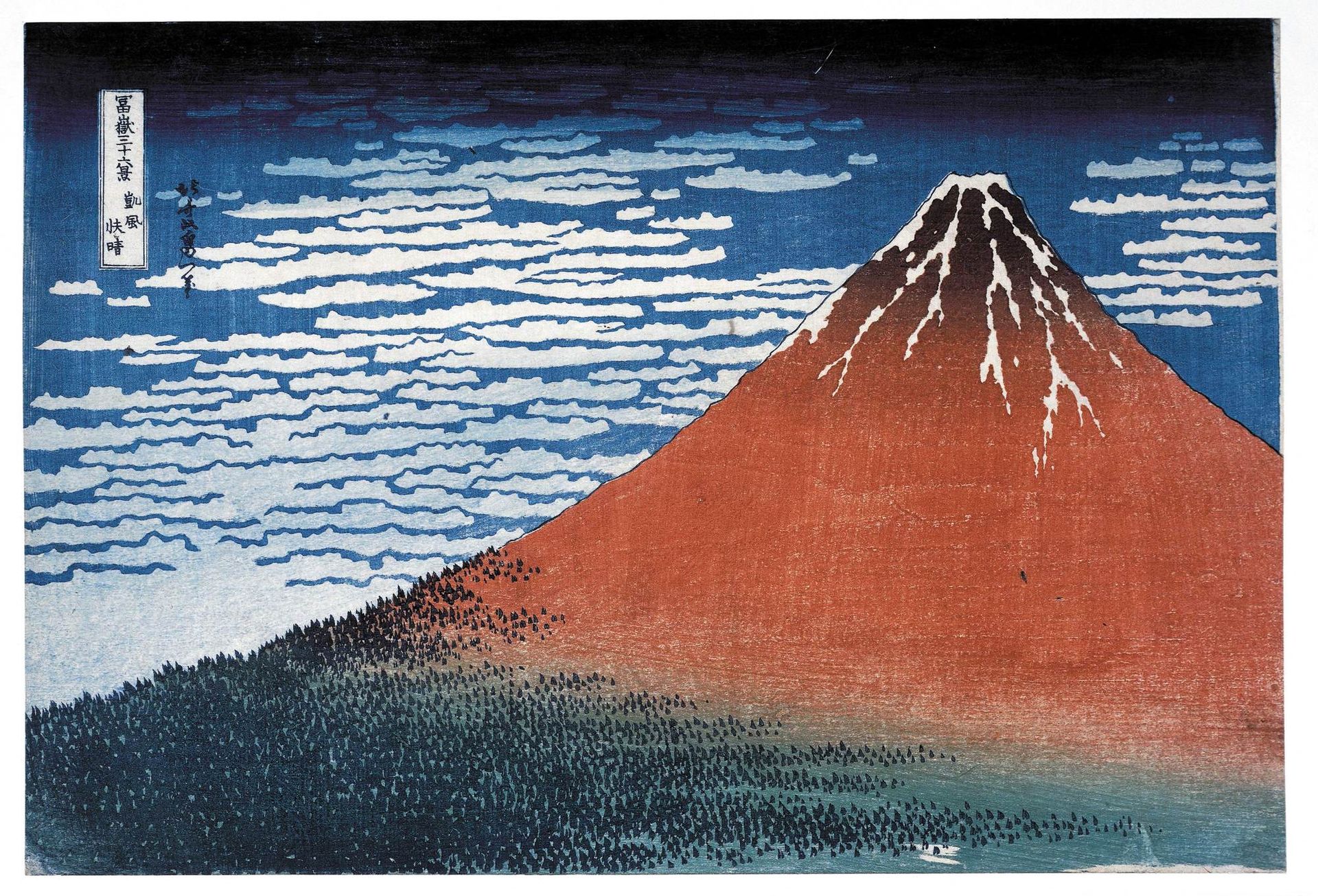 Red Fuji is part of Hokusai's portfolio Thirty-six Views of Mt Fuji, which he produced after turning 70. In Red Fuji, the artist depicts a specific time and place: the eastern side of the volcano with the sunrise over the Pacific. Hokusai originally titled the print Clear Day with a Southern Breeze, but it was later re-named because of its powerful colours. The southern breeze referred to in the original title alludes to the winds of later summer, during which snow survives only in the crevices at the summit.
