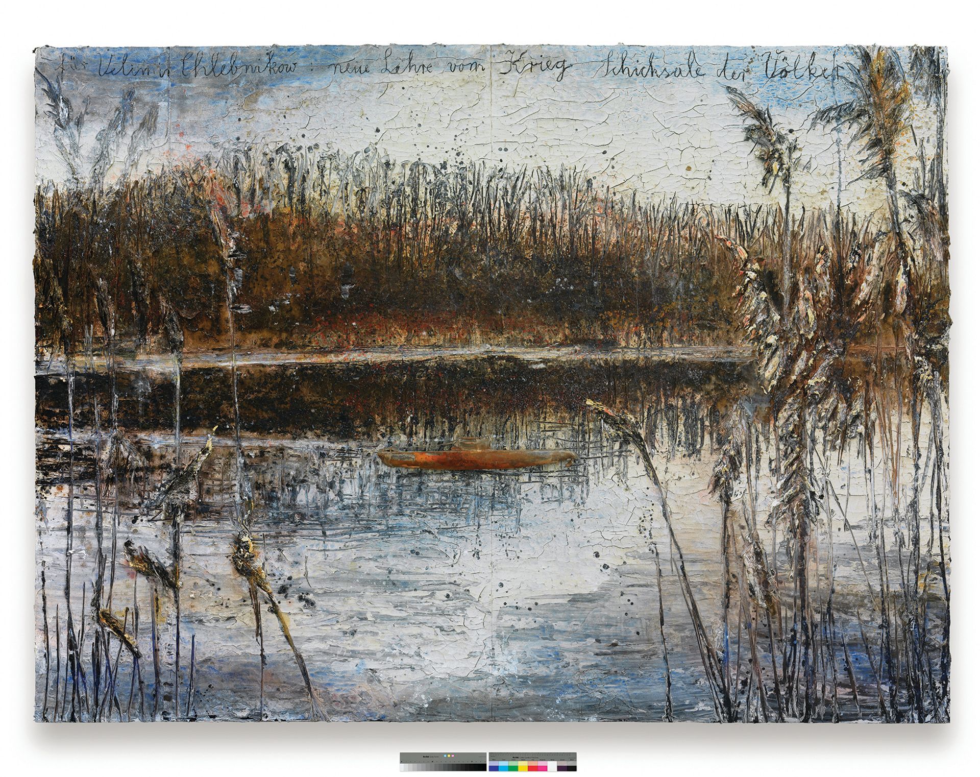 Kiefer was inspired by Khlebnikov’s numerological theory of history, which drew on the great battles of the past to foretell future cataclysms. The poet was hailed as the King of Time, predicting in a 1912 pamphlet that a state would fall in 1917. He was “a poet of the revolution, and a revolutionary of the poetic idiom”, according to Piotrovsky.