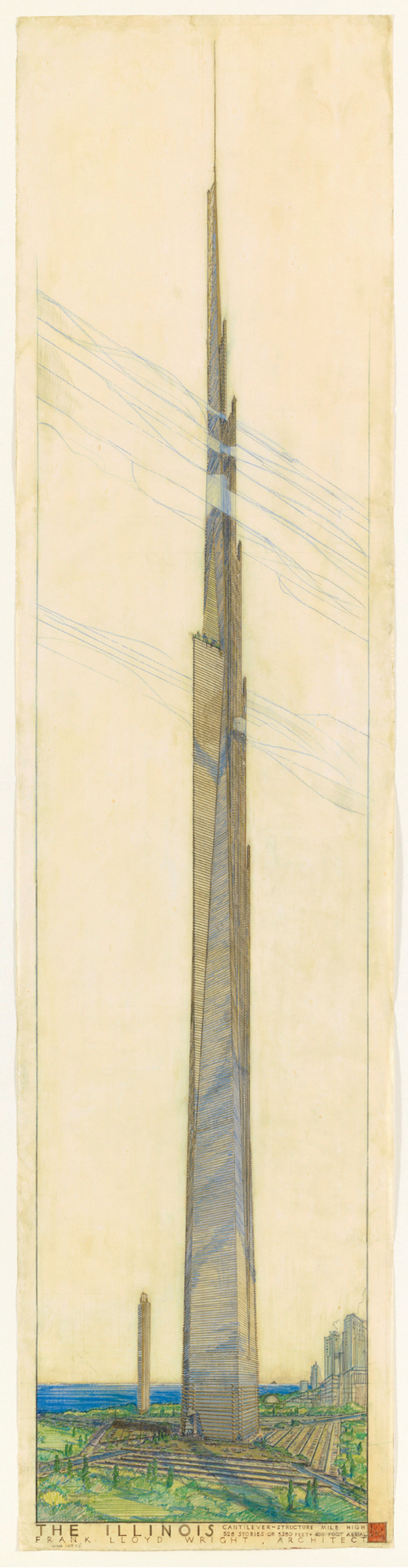 On 16 October 1956, Frank Lloyd Wright hosted a press conference at Chicago’s 1,700-room Hotel Sherman. Perhaps the US’s most famous architect needed a truly big venue to unveil the Illinois, a proposal for a mile-high skyscraper boasting 528 floors, served by 56 atomic-powered elevators, housing 130,000 tenants and equipped with a garage for 15,000 cars and twin helipads for 100 helicopters.