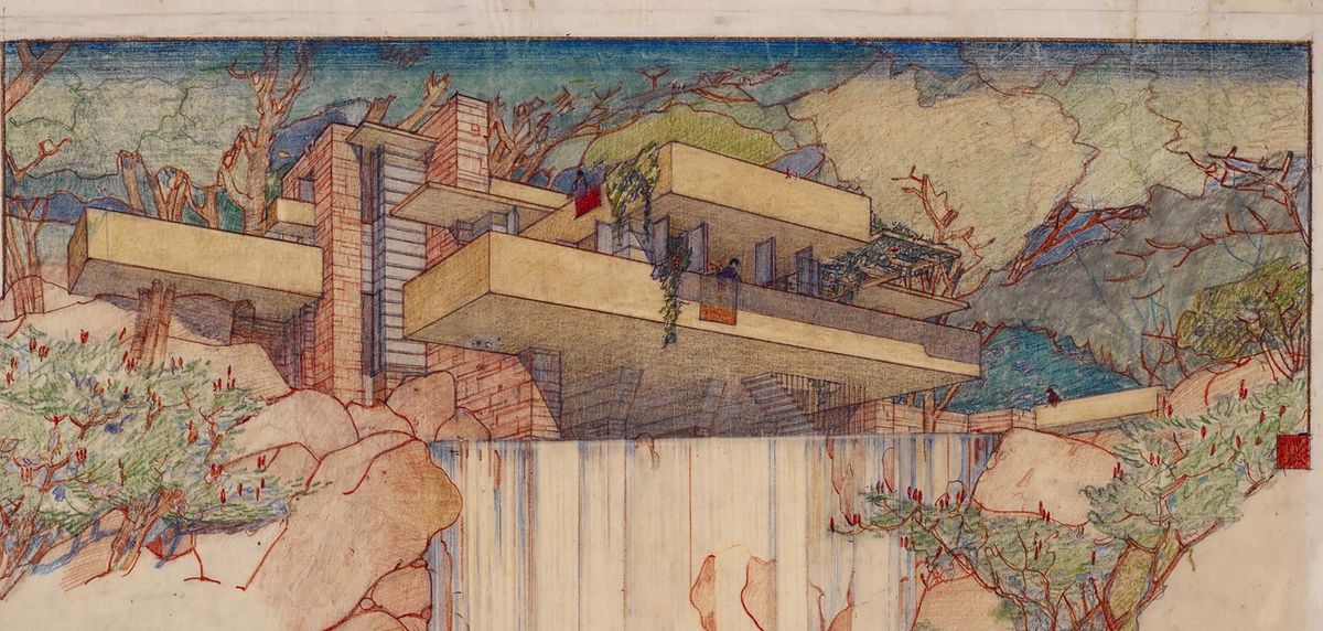 Driven by big ideas and a desire to reach nationwide audiences, Wright mastered any number of presentation techniques, from coloured pencil drawings to books, magazines, exhibitions, monographs, films, radio and television. He even appeared on the popular TV quiz show, What’s My Line? He also knew—the MoMA exhibition is very good on this—how to attract talented young assistants, some straight from high school, who, quite simply, drew beautifully. In fact, the MoMA exhibition reveals many of the set-piece Wright drawings to be the work of assistants, notably Jack Howe, known as “the pencil in FLW’s hand”, who, joining the studio in 1932 aged 19, was its chief draughtsman from 1937 when Fallingwater in Pennsylvania—one of the most renowned of all US buildings—was under construction.