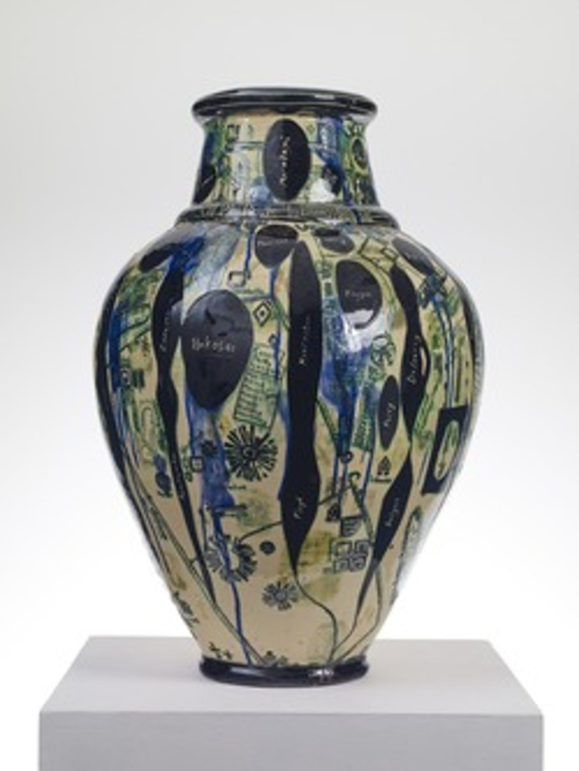 The vote last June provides the theme for two of his largest vases, Matching Pair (2017), completed only last month and made in collaboration with members of the public. Perry put out a series of calls to those on either side of the Leave/Remain debate, asking for images of themselves, their tattoos, favourite brands, favourite colours or famous people who represent their values to build a picture of each side of the divide.