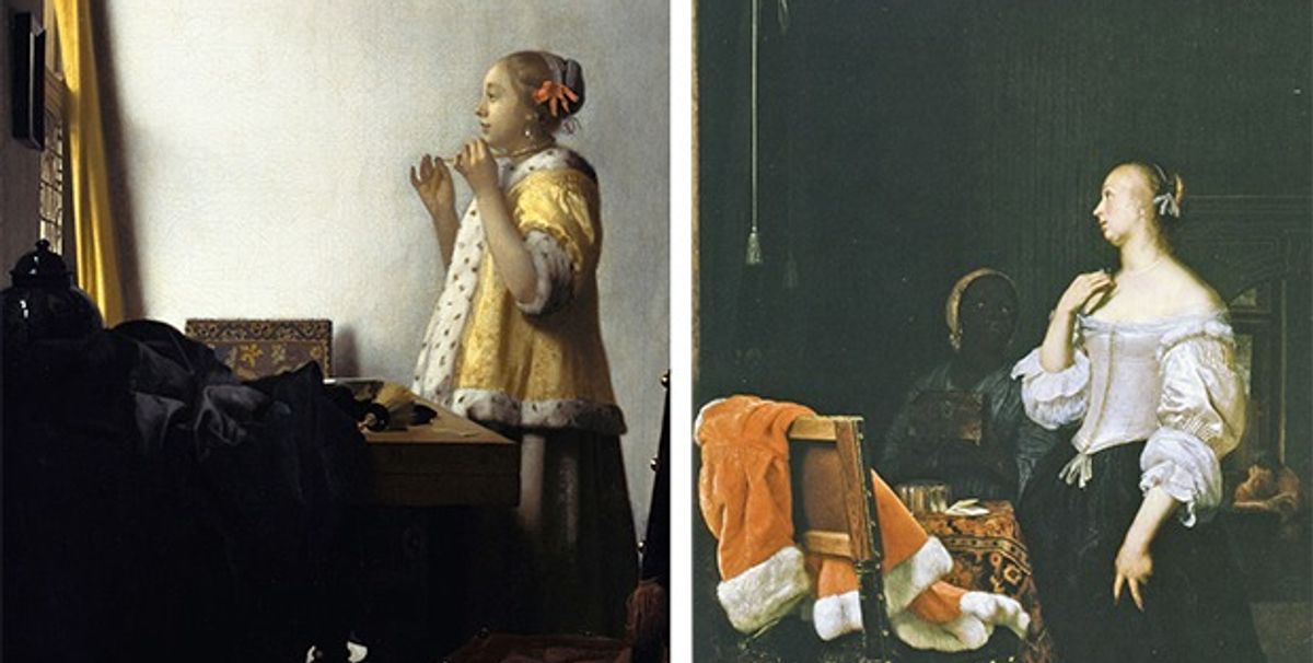 Attractive as this scenario may sound, Vermeer’s principal source of inspiration was not a serendipitous encounter at his home in Delft. Rather, it was a trip the artist made to Leiden, where he admired Frans van Mieris’s Woman before a Mirror. Completed one or two years earlier, this painting also depicts a female figure in profile putting on a piece of jewellery. In both paintings the women stand in front of a table with a chair in the foreground serving as a repoussoir. The play of contrasting vertical and horizontal lines in both paintings is so similar that there is little doubt that Van Mieris’s picture, rather than Catharina’s morning toilet, inspired Vermeer to paint Woman with a Pearl Necklace. Yet Van Mieris had not spontaneously asked his wife, Cunera van der Cock, to hold her pose either. The Leiden painter, in turn, had drawn inspiration from Young Woman at her Toilet with a Maid by Gerard ter Borch. Some ten years earlier, this artist from Deventer had painted a lady standing in front of the mirror, similarly engrossed, fiddling with an accessory—not a necklace, but a bow of her corset. Ter Borch had represented her full- instead of three-quarter length, and had depicted her looking to the right rather than the left. Yet the overall similarities in subject, composition and figure poses indicate that Van Mieris had studied Ter Borch’s painting in preparation for his own.