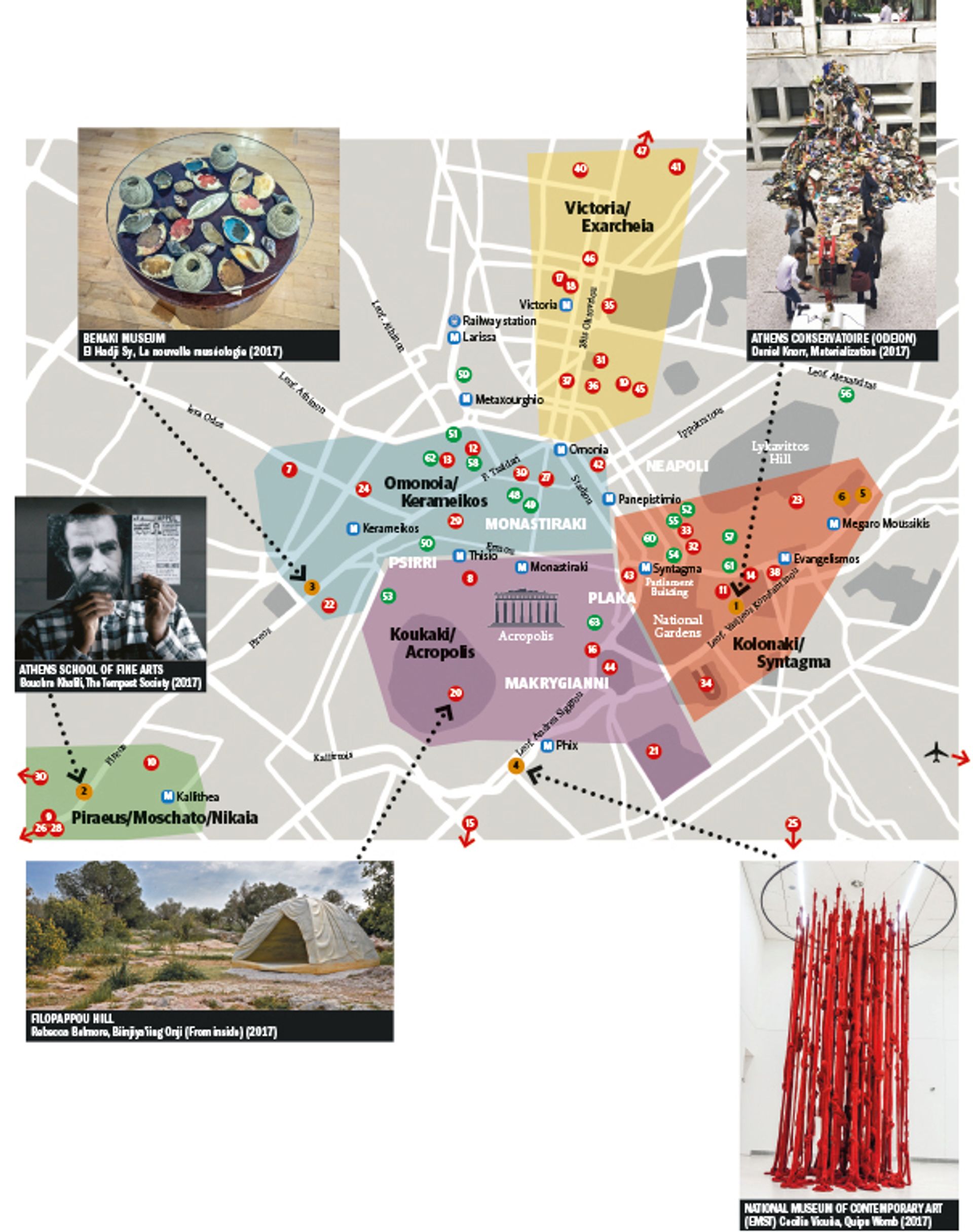 Documenta 14 in Athens is a sprawling, unnavigable, city-wide exhibition—but don’t get lost among the ruins of the Acropolis: to help you spend more time looking at art and less time on Google, we have produced this map to guide you through this maze.