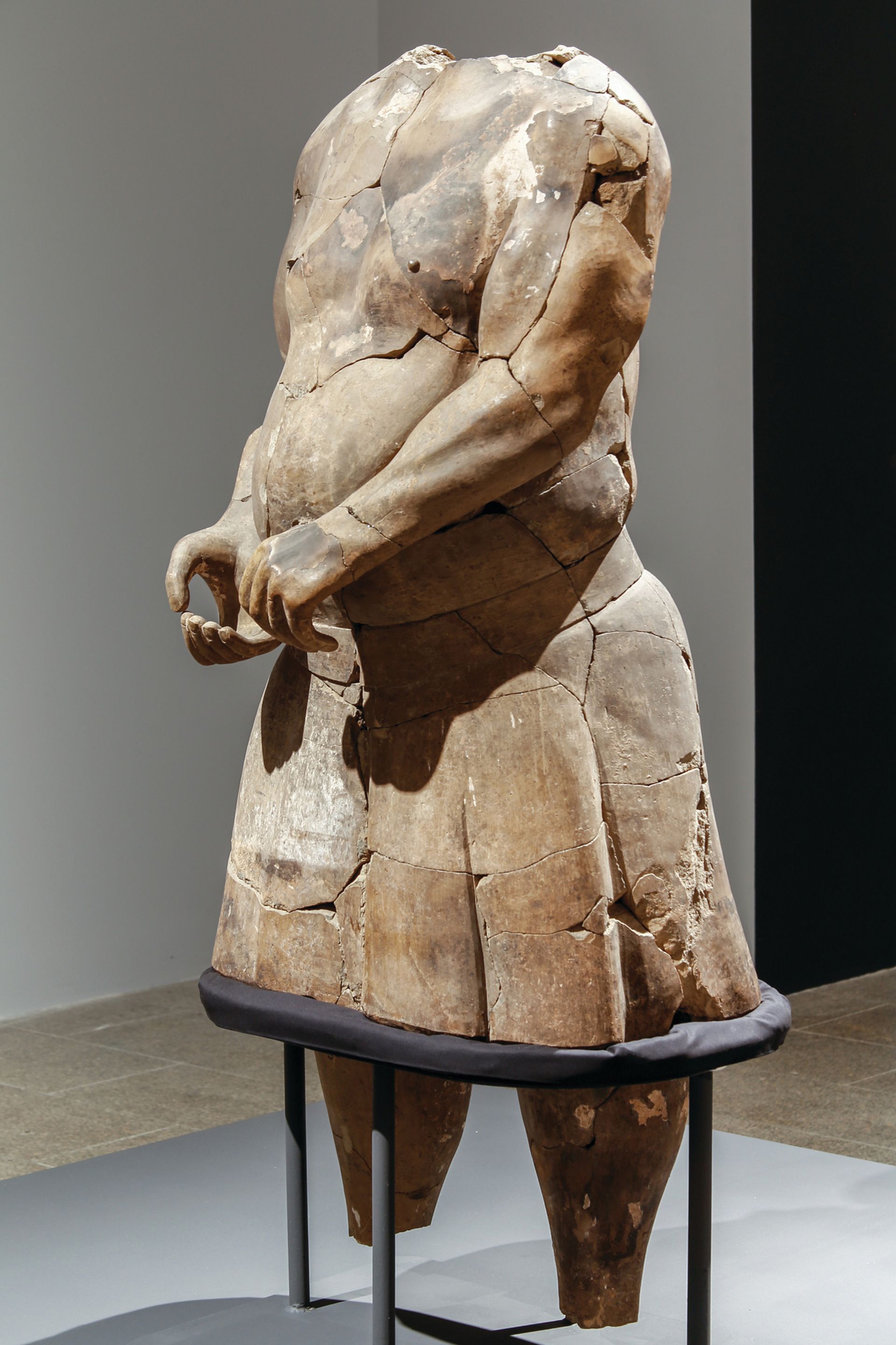 The artisan who made the figurine not only handled anatomy well; he also captured its sturdy, muscular physique, especially the bulging muscles of his chest and arms, his hefty belly and brawny hips. Some figurines from the burial pit that are not in the exhibition even stand in the contrapposto pose that marked a significant development in Greek sculpture after 480BC. The pose, in which weight rests on one leg, freeing the other, allows a sculpture to appear more dynamic.