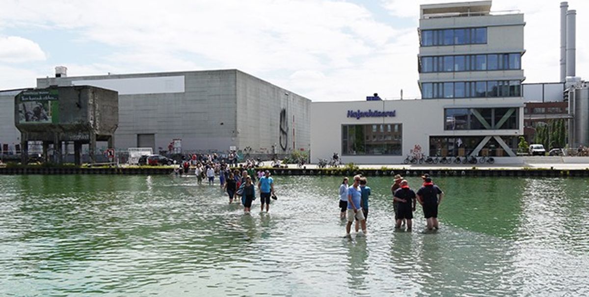 The basin on the Danube Ems canal is now rarely used for shipping and the once run-down former industrial area is transforming, first with studio spaces and now on the north side into a lively bar and restaurant area. The Turkish-born, Berlin-based artist Ayse Erkmen has created a “bridge” across the basin by sinking grilled metal cages under the water level. The crossing is invisible except close up: the public is invited to take off their shoes and walk across, apparently walking on water. Erkmen’s work makes us to look at our surroundings in unfamiliar ways, while the creation of the new crossing encourages us to think about boundaries and how they are made and disrupted. Not to mention the fact that splashing in the chilly water is fun.