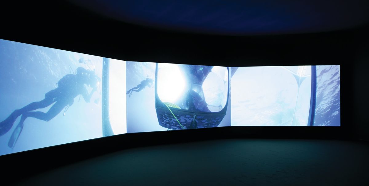 Visitors to Unlimited can get a sense of the sculptures in a film called Underwater Pavilions (2017), produced by the artist in collaboration with the ocean conservation organisation Parley for the Oceans. It was filmed when the pavilions were moored off the coast of Los Angeles in late 2016.