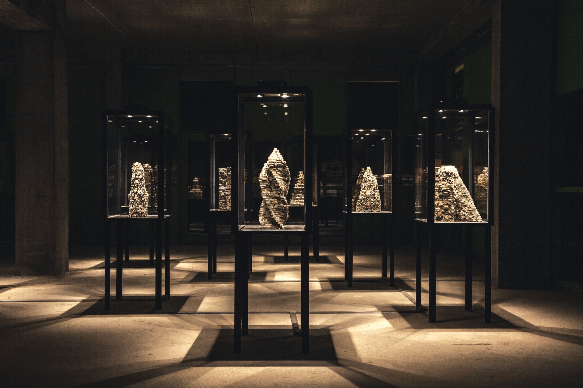 Shown at the Palais de Tokyo in Paris as part of the Biennale de Lyon in 2013, this installation is made up of a set of atmospherically lit vitrines. Inside each vitrine is a structure resembling ancient monuments made from plaster mixed with fructose and lactose, plus water from major rivers, such as the Nile and Yangtze—themselves the source of powerful myths. Bacteria grows and the works slowly crumble. Charrière describes time as “an object of fascination for me” with “an inherent complexity that I try to address in my work”.
