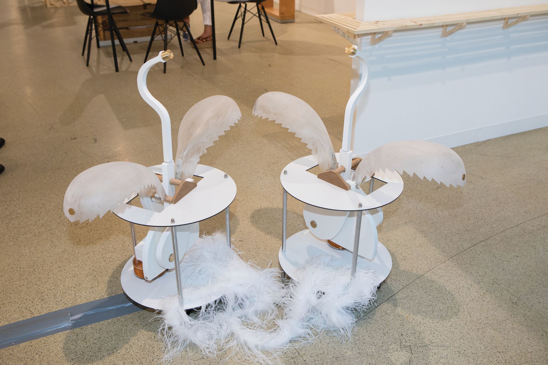 An electrified copper coil and magnets power these bobbing birds. Nicolas Krupp regularly brings kinetic works to fairs. “They capture people’s attention,” he says. The pair could be yours for €38,000.