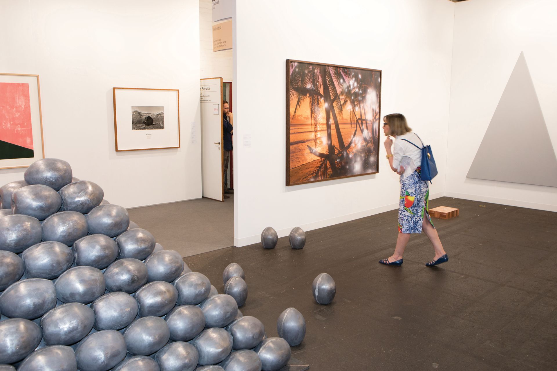 A pyramid of lead coconuts and a large-scale photograph of what looks like a typical postcard of a far-flung tropical island dominate the stand of Galerie Tschudi. Both are works by the young Swiss artist Julian Charrière. “At first glance, Poplar—First Light just looks like a 1970s photograph that someone might hang on the wall of their living room or bedroom, but there is an underlying context to it that is not immediately apparent,” Wetzel says. It depicts Bikini Atoll in the Marshall Islands, where the US conducted more than 60 nuclear tests in the 1940s and 1950s. Charrière introduced radioactive sand in the developing process, which caused curious white spots to appear in the photograph. Pacific Fiction—Study for a Monument is also from the artist’s excursion to Bikini Atoll. For this piece, he gathered coconuts—which along with everything else on the island have been exposed to radiation—and wrapped them in lead to contain the danger. “It’s interesting because he is protecting us from ‘nature’ and it’s usually the other way around,” Wetzel says.