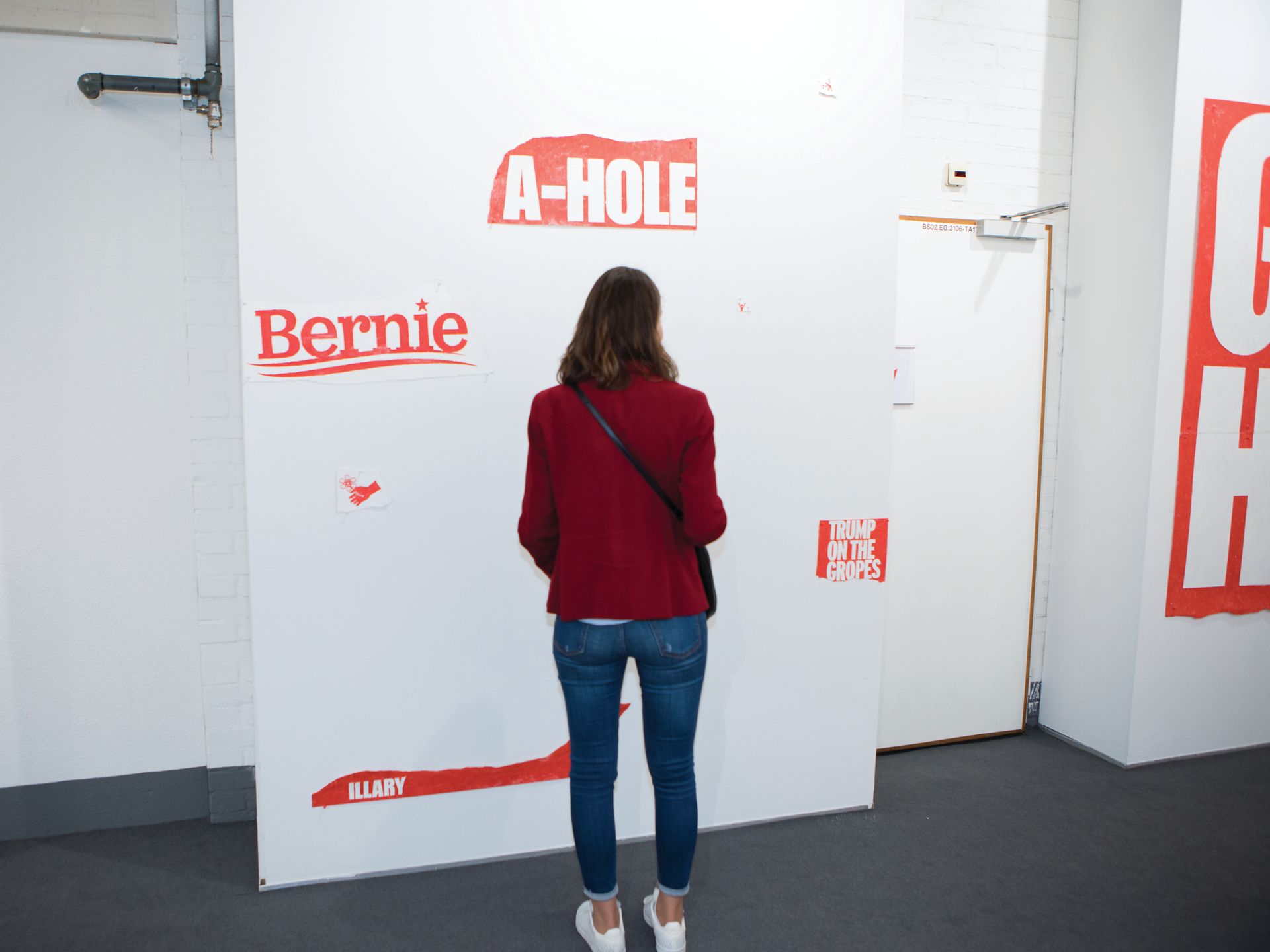 “This piece contains a little bit of everything: politics, such as the words ‘Trump on the gropes’, which was actually made before Trump was elected; and comments on anti-consumerism,” Wetzel says of Michael Landy’s ongoing series Breaking News, which features red-and–white drawings and words such as “A-Hole” and “Bernie” on sheets of torn paper. “Landy is a wonderful artist,” Wetzel says. “He did extensive research on Tinguely’s Homage to New York, the first self-destructive work in the history of art, which the Swiss artist showed at the Museum of Modern Art’s sculpture garden in spring 1960. Among a lot of other works, Landy created a film in which he interviewed many people who were present at that time. Very often, he develops his critique towards consumerism in long-term projects, where a lot of research and personal involvement is [part of his process]. In his multifaceted work, he is sharp, persisting and humble at the same time.”