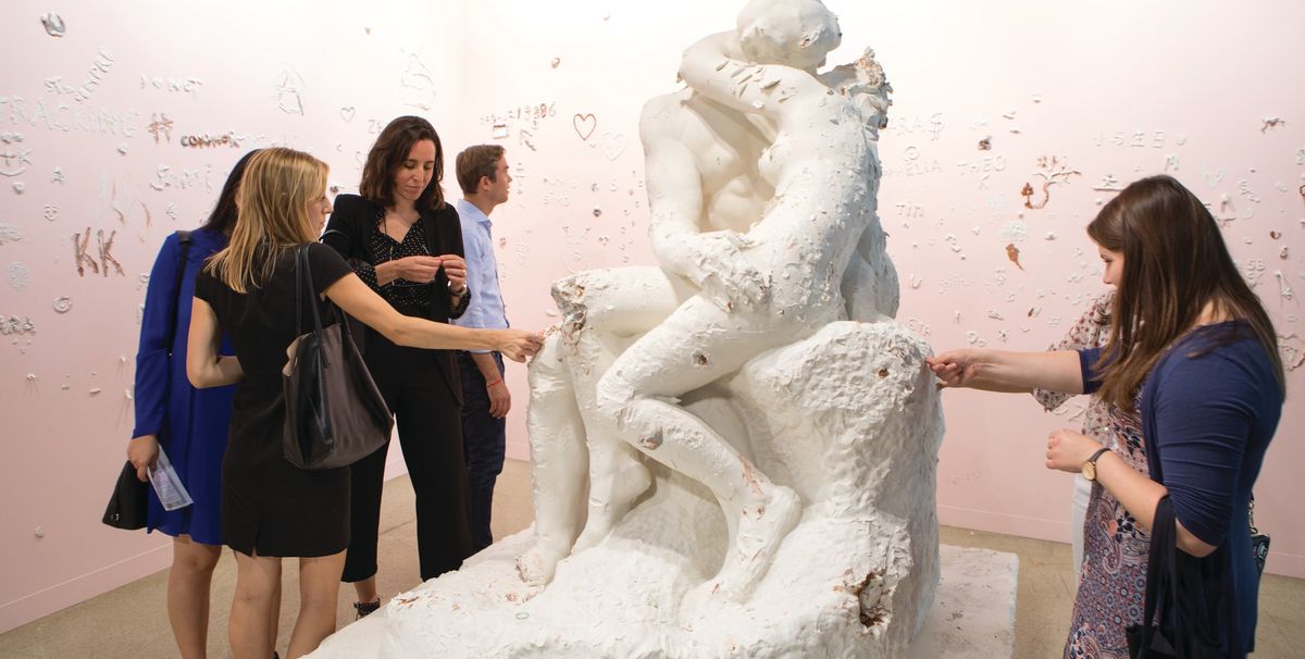 Fairgoers can’t seem to walk by Urs Fischer’s Plasticine version of Rodin’s The Kiss without needing to put their artistic skills to the test. “Everybody likes to touch,” Wetzel says. “You can already see how much the work has changed since the fair opened on Tuesday.” He likes the interactive element of the piece as it fits into the Tinguely Museum’s ethos of involving visitors in the collection. “I think Fischer has done this in a very clever way with this work,” he says. The piece also touches playfully on the act of destruction and behaviour outside the boundaries of convention. But Wetzel is less interested in destroying than restoring it. “I think I fall into the group that is more concerned with repairing it; I feel like I should be trying to fix it,” he says, as he tries to smooth the imprints left by others.