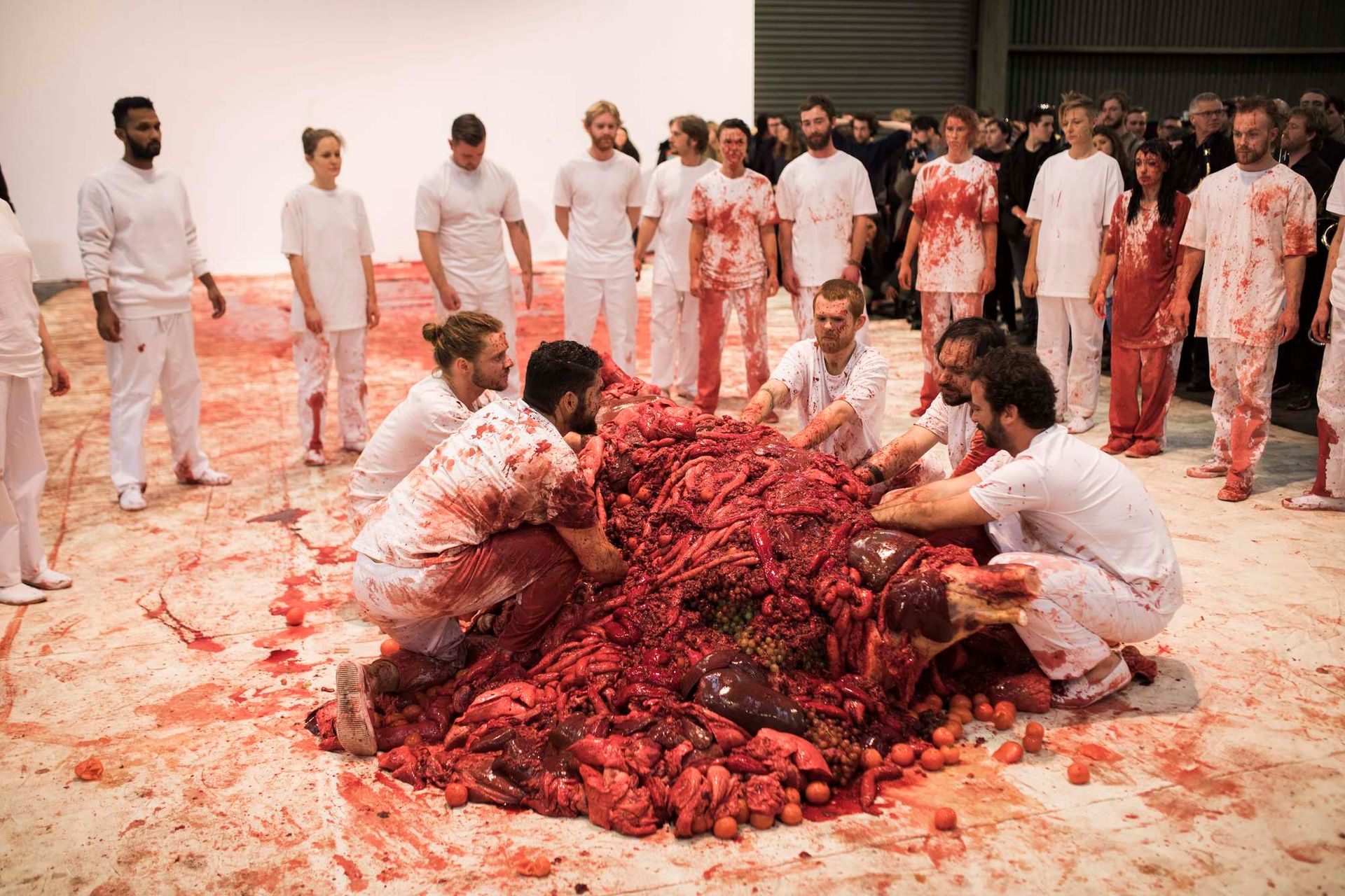 As 150.Action reached its bloody climax, performers scrapped it out over the carcass. As organs, flesh and fruit tumbled out of the scrum, participants hurled them back in, as blood was thrown over them for dramatic affect.