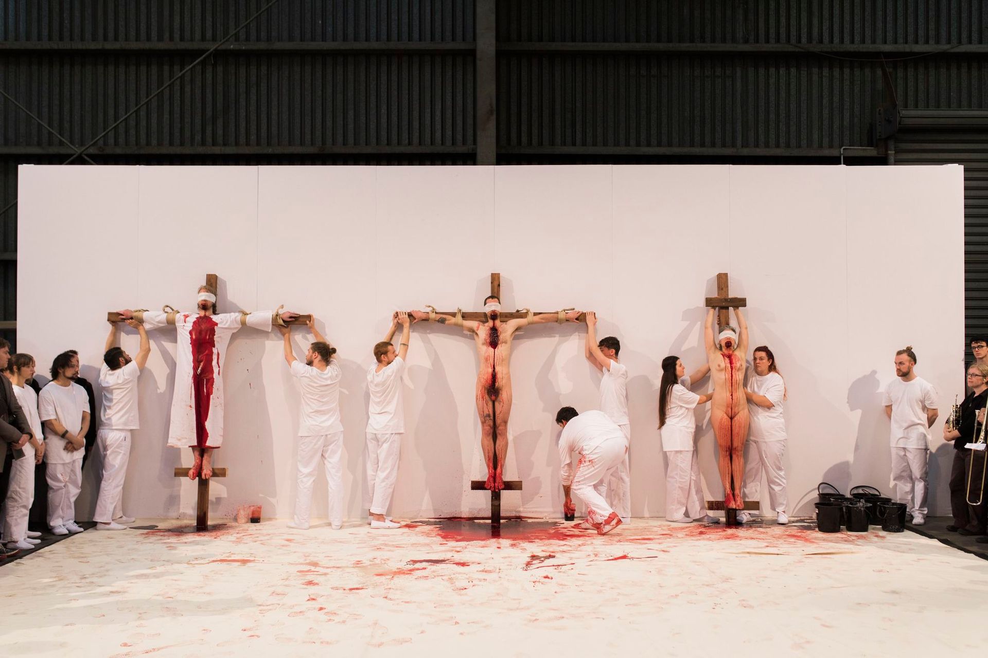 Seventy-eight-year-old Nitsch did not take part in 150.Action, instead he presided over the performance, which took place on a tennis-court-sized white canvas floor in a disused warehouse. Nitsch’s long-term accomplice Leo Kopp, directed, while his assistant Joseph Smutny, led 30 performers through a physically gruelling, blood-covered performance accompanied by a score composed by Nitsch, and a 20-piece brass band.