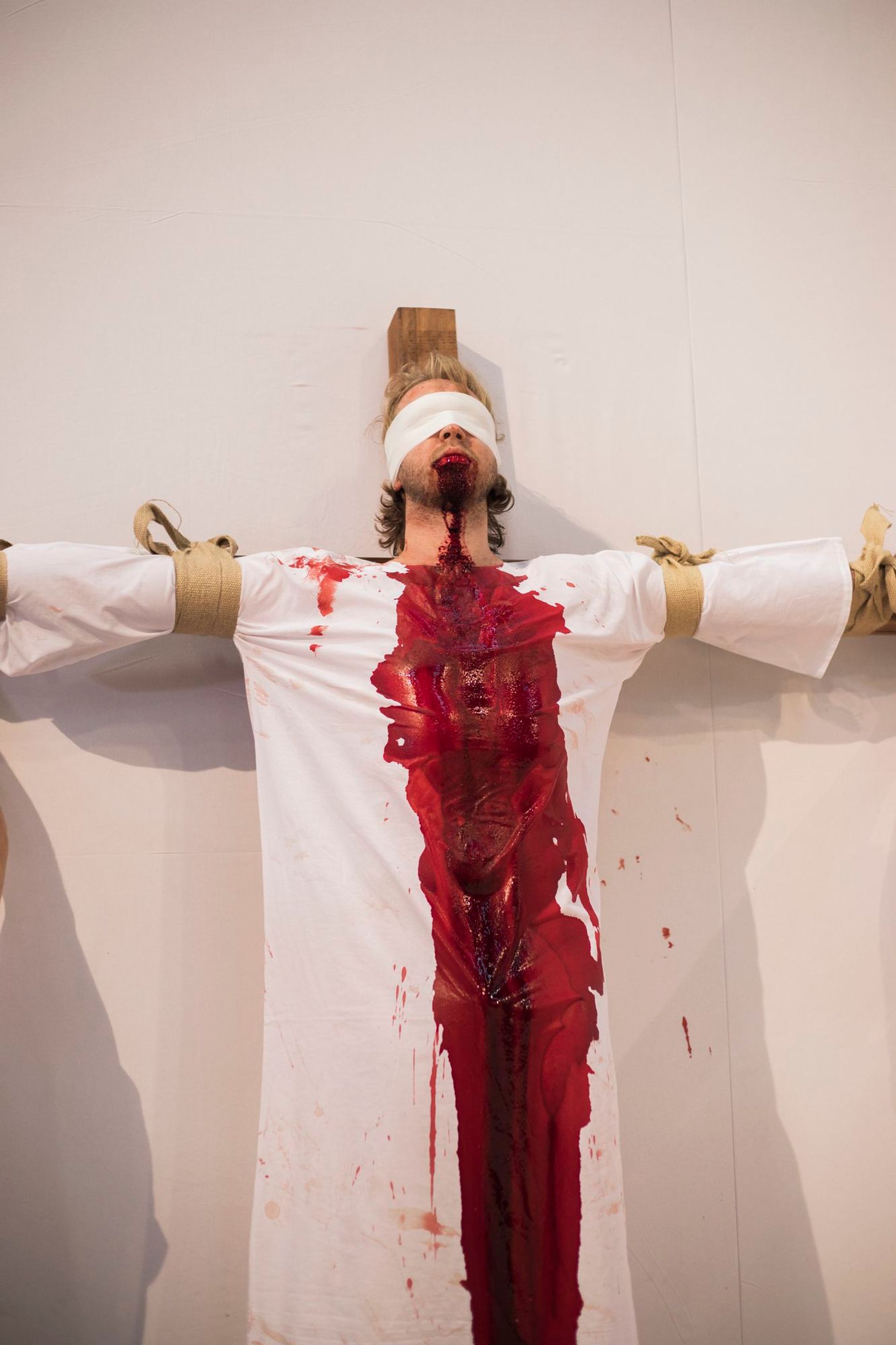 Throughout the three-hour “action”, performers, some dressed in tunics, others naked, but all blindfolded, were strapped to crosses and forced to drink blood, water and milk. In the second hour the bull carcass appeared, more mock-crucifixions took place, before the carcass was hoisted on a gallows-like structure and lead around the room. Eventually, the carcass was lowered to the ground and covered with fruit and entrails.