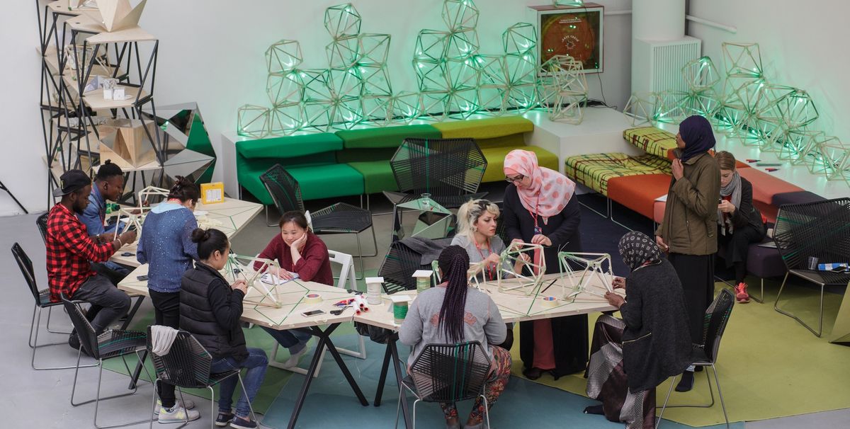 This year at the heart of the main exhibition at the Venice Biennale, the art world’s greatest gathering, there is a workshop where refugees and migrants, some from Africa, others from the Middle East, are making lamps designed by the Danish-Icelandic artist Olafur Eliasson. Visitors can join around 40 volunteer migrants, who are being housed on the Venetian mainland, to help them in their task until July and again in the autumn. The artist’s geometric design with an LED light is best put together by two people, so encouraging conversation.