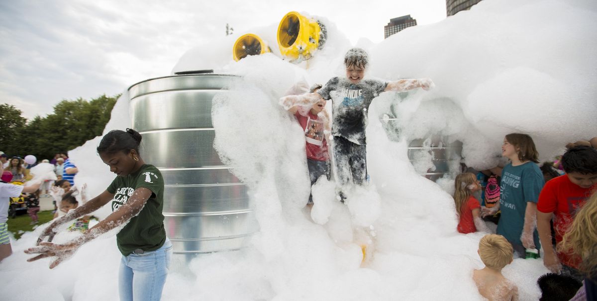 You might not need a sudsy bath—but you will need a rinse—after a visit to a new interactive installation by the London-based sculptor Roger Hiorns, located in a lakeside park at Chicago’s Navy Pier landmark. The work, A retrospective view of the pathway, is made of three huge stainless-steel tanks that erupt with a non-toxic, biodegradable detergent foam. Visitors are welcome to frolic in the froth that spills out of the tanks onto the surrounding grass. The work was unveiled on 21 June as part of the Summer Solstice celebrations, and is also a sneak peek of what might be in store for Navy Pier’s steady fermentation into an arts district. A retrospective view of the pathway is part of EXPO CHICAGO’s IN/SITU Outside temporary installation programme, and will remain on view through the run of the fair, to be held at Navy Pier (13-17 September).
