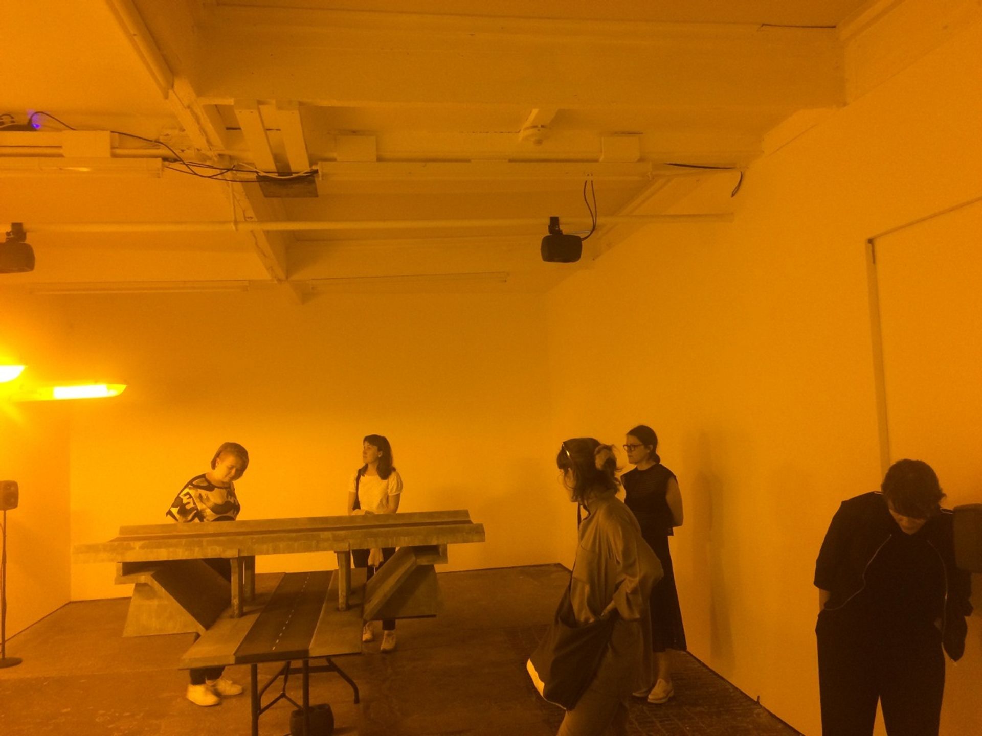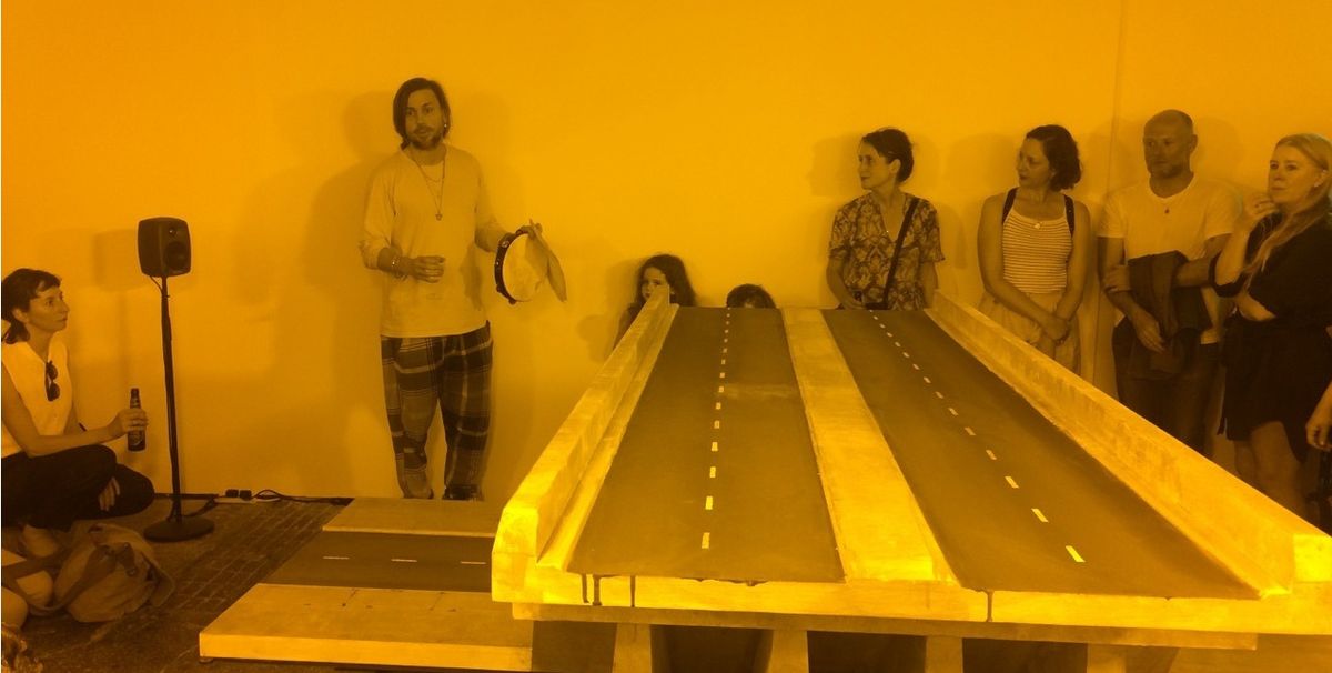 Bathed in the Lucozade-yellow of sodium streetlights, the packed PV crowd enthusiastically belted out Leckey’s poetic tirade that aims to exorcise the demons of a concrete motorway bridge on the M53, which has also been lovingly recreated in model form at Cubitt.