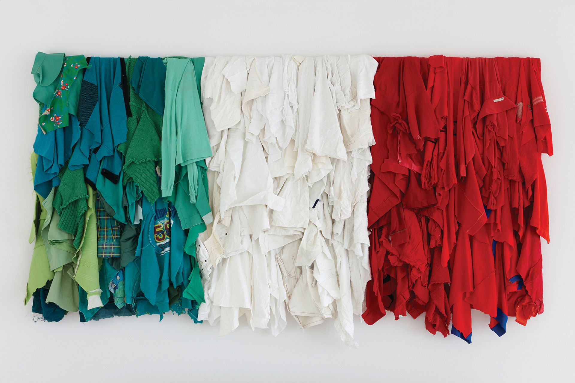 An Italian flag made of old rags grouped by the colours green, white and red, this commission by the collectors designates Magazzino as a kind of Italian embassy.