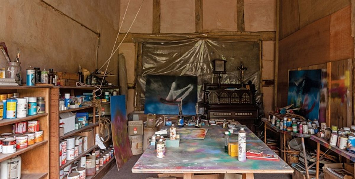 A workbench littered with cans of spray paint in every imaginable colour, boxes overflowing with tubes of acrylic paint, toy trucks, forks, a pipe organ with a crucifix sitting on top of it, a jar containing what appears to be a fish preserved in formaldehyde, pairs of eyeglasses and shoes, a Second World War-era Vickers machine gun case and a London A to Z guide. When the Australian-born artist Sidney Nolan died in the UK in 1992, where he had moved in 1951, his widow closed the doors to his studio, preserving everything inside just as Nolan had left it. This summer, the charitable trust that runs the Rodd—Nolan’s 250-acre farm in Herefordshire—is temporarily opening his studio to visitors as part of celebrations to mark the centenary of the artist’s birth.
