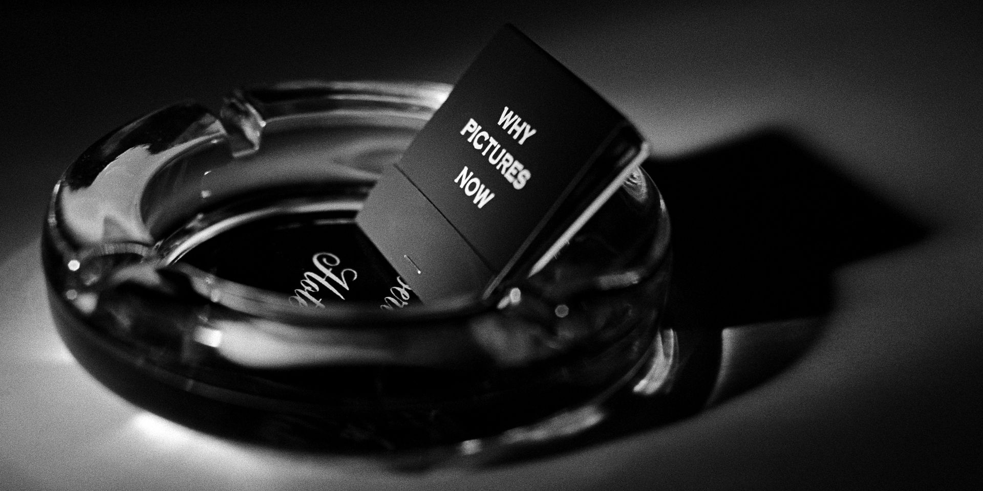 It’s a tight, close-up, black-and-white shot taken with a wide aperture, and the print itself is small: just three by six inches. In the centre of the picture is an ashtray, and inside it, a book of matches. Across the book, three unpunctuated words appear in sharp focus—WHY PICTURES NOW—which brings into relief the focal blur from which the phrase emerges. There is no way to tell whether the capital emphasis is orthographic or typographic: the typeface used is Copperplate Gothic, a 1905 font for which there exists no lower case. The letters appear obliquely, as the closed matchbook is propped up at an angle on the side of a spotless glass ashtray. This luscious photograph, diminutive in scale and wide in aspect ratio, formally cool and collected, essentially noir in content and cinematic in width, contains two further surprises. On the bottom of the ashtray, in riotous cursive script, the first three letters of “Hotel” are clearly legible: Hot. And the whole thing, in its nondescript position along the second wall of Louise Lawler’s survey at the Museum of Modern Art (MoMA), is framed in a slender rectangle of outrageous canary yellow.