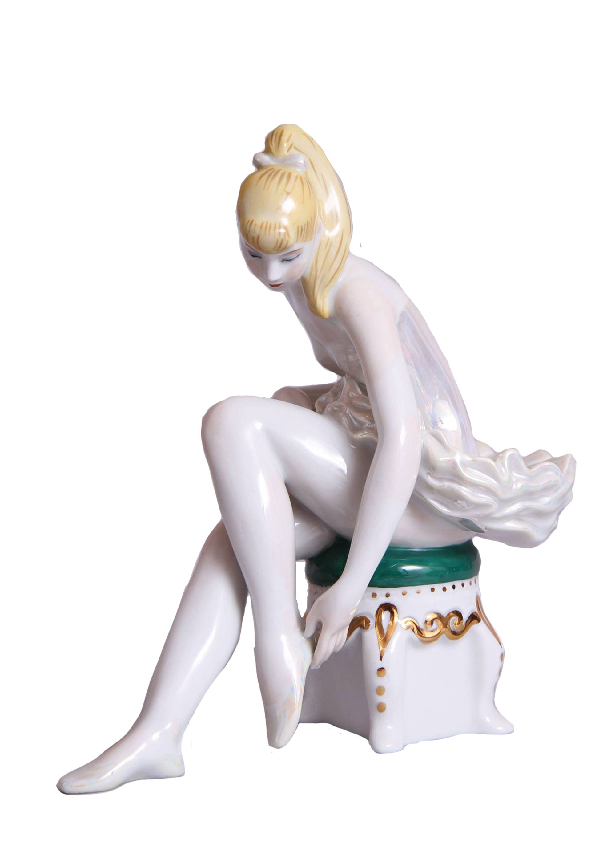 Koons’s Seated Ballerina is based on a work called Lenochka—an affectionate diminutive of the name Elena—by Zhnikrup. Her other statuettes ranged in subject matter from literary characters, including the Russian and Ukrainian writer Nikolai Gogol and the Danish author Hans Christian Andersen, to ideological depictions of teachers and peasants.