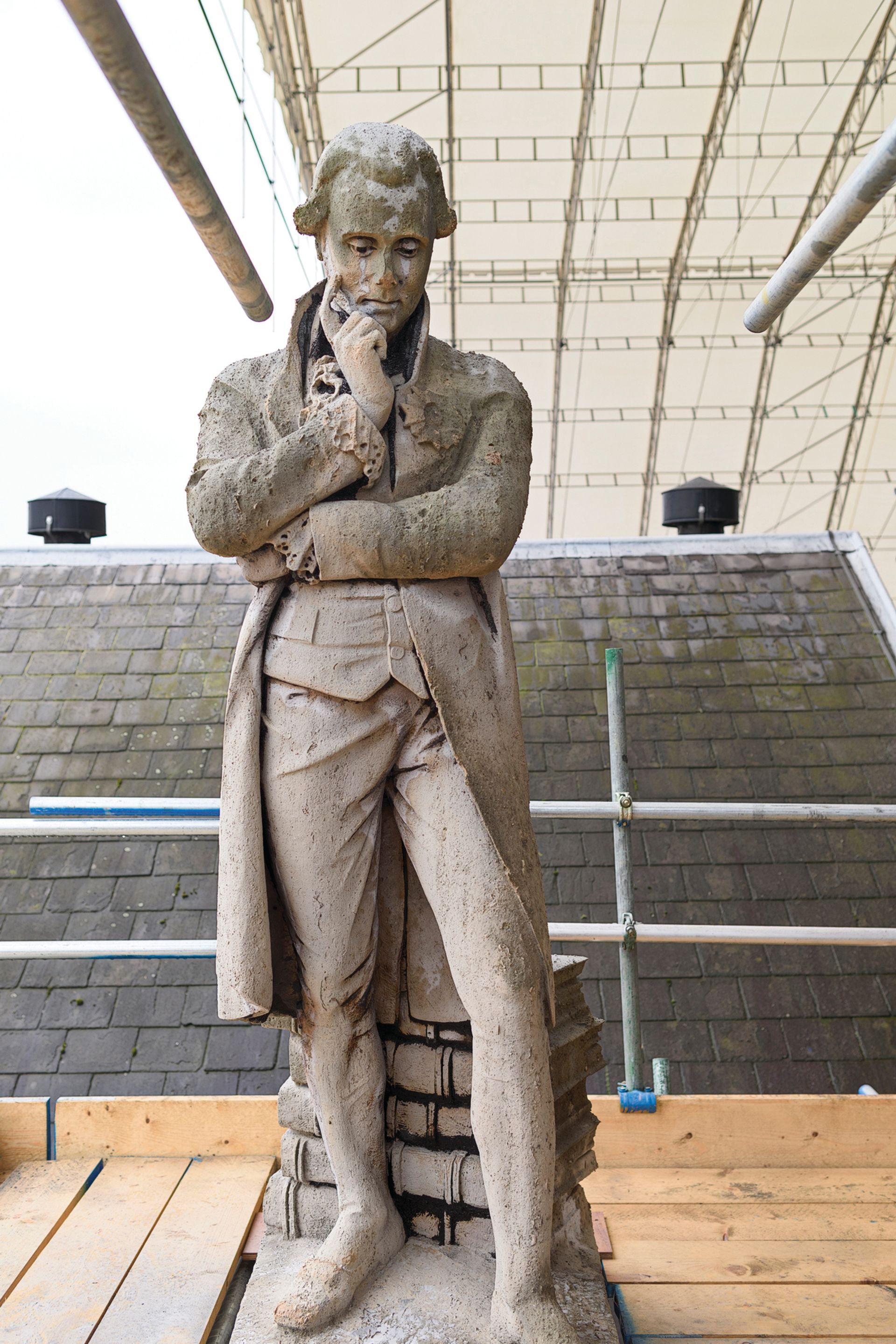 Around 90% of the dirt and grime was removed with the application of water and steam. A very soft aggregate was blasted onto the stone to get rid of the more stubborn stains. “You have to be careful what you blast the stone with,” Thow says, explaining that the sand typically used in the 1960s and 70s “stripped the external surface of the stone. It can be aggressive and strip away the patina that comes with age. If you’re doing this on sculpture, you start to lose the detail.”