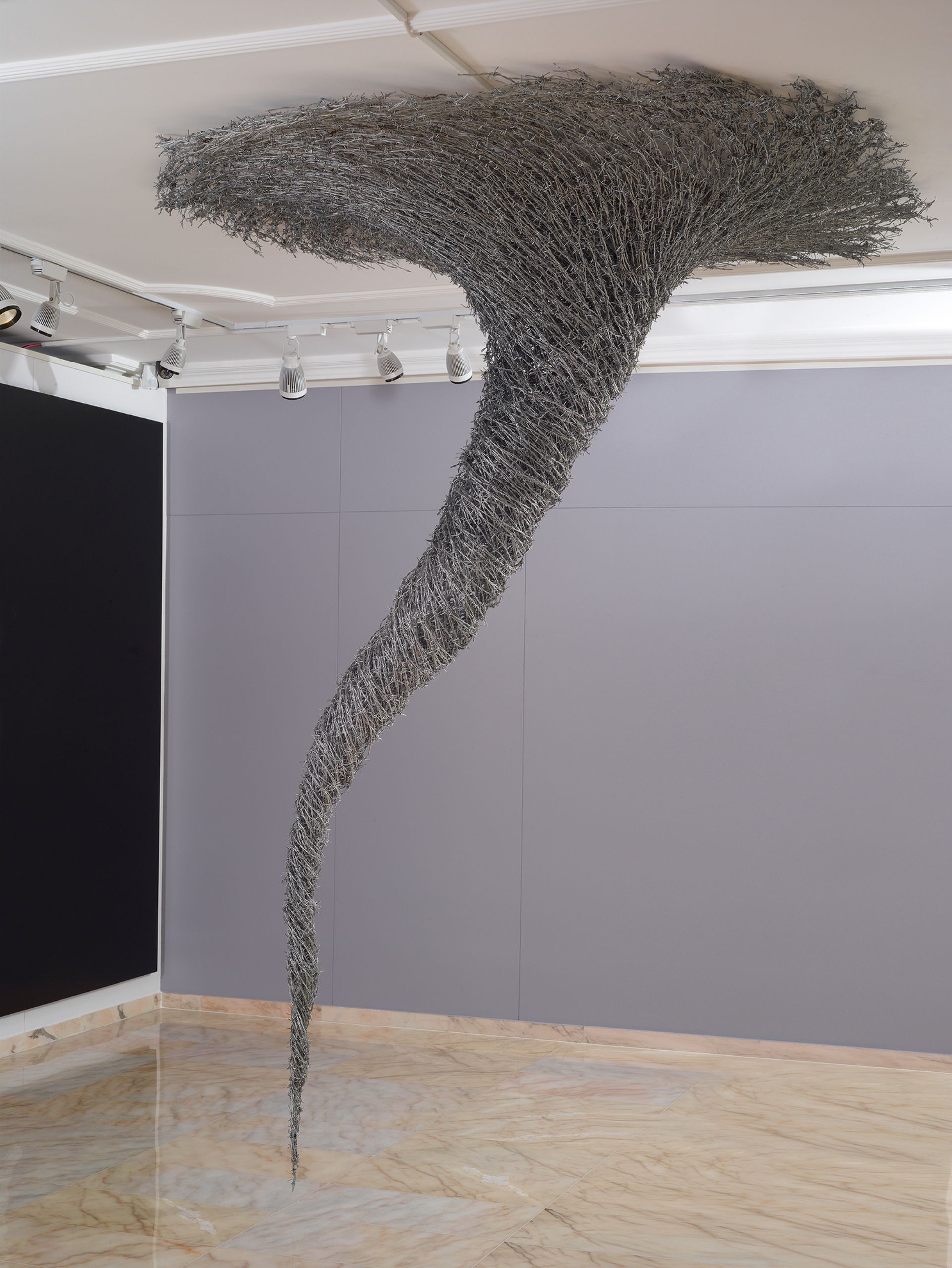This three-metre-high sculpture was made by hand from more than 500 metres of barbed wire. It is a visual metaphor for refugees caught up in natural disasters. “This Palestinian artist could live anywhere but he chooses to live and work in the Sabra refugee camp to teach kids about art,” Dalloul says.