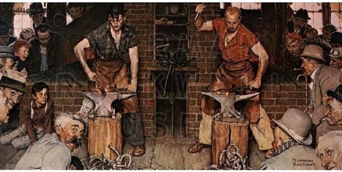 Among the 40 works to be sold are two paintings by the American artist Norman Rockwell, including Shaftsbury Blacksmith Shop (1940) and Shuffleton Barbershop (1950)—works that were given to the museum by the artist. The painting of a pair of smithies competing in a horseshoe forging contest was made to illustrate Edward W. O’Brien's short story Blacksmith’s Boy—Heel and Toe, which ran in the Saturday Evening Post, on 2 November 1940. The work Shuffleton Barbershop, painted for the cover of the 29 April 1950 issue of The Saturday Evening Post, was the inspiration for a 2013 television movie staring Danny Glover.