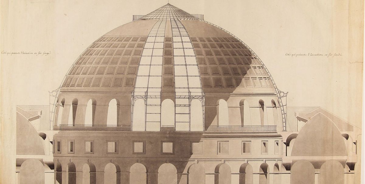 “One remarkable drawing testifies to the group’s [Bélanger and Hittorff] first reflections on the design; it shows cross-sections of the dome, comparing the use of cast iron and wrought iron for the project,” he writes. “Several more drawings detail precisely the geometry of each piece, then how these were assembled. These are addressed to the Le Creusot metal forge [in Bourgogne], which cast all the elements.”