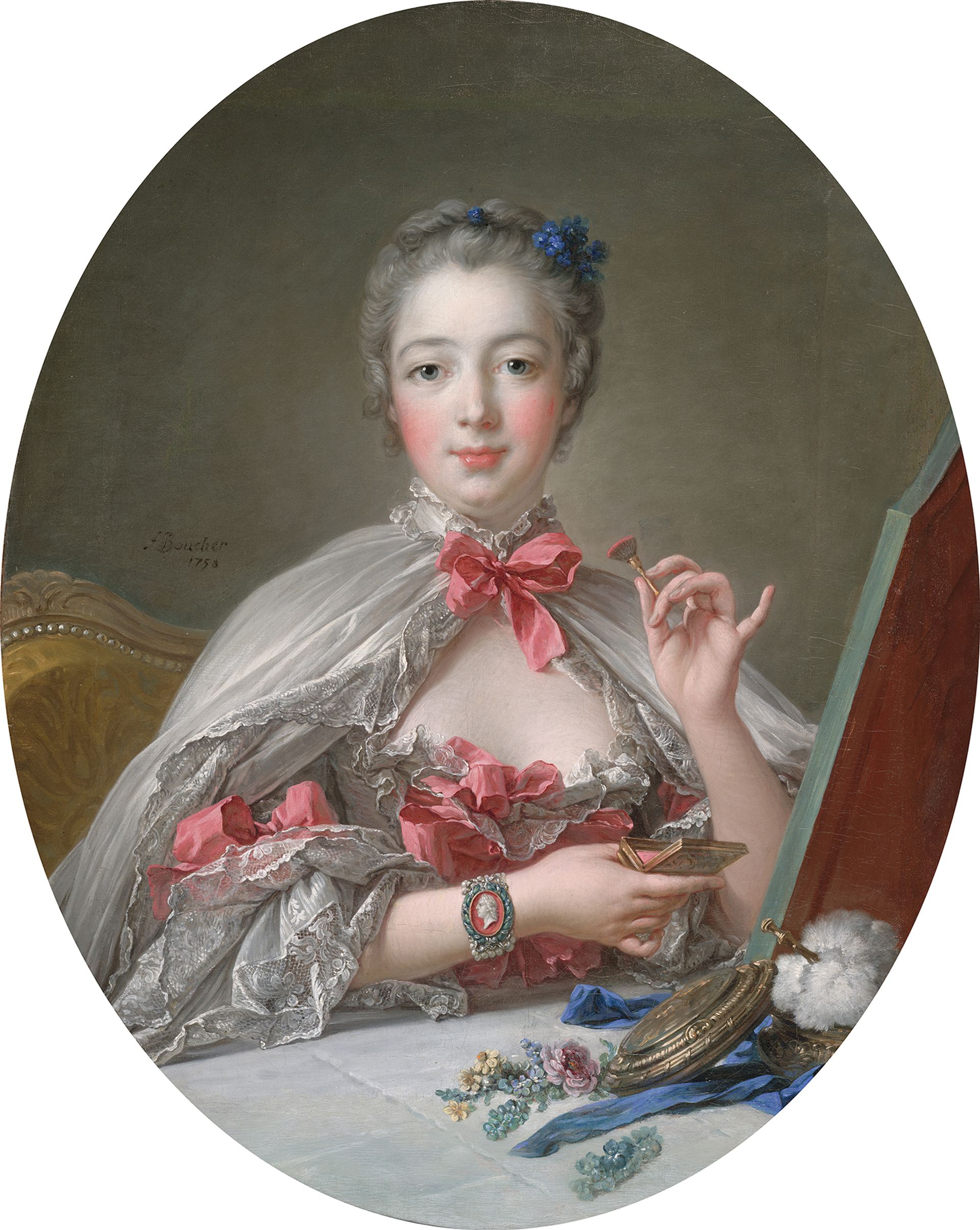 Not long after Jefferson praised David’s clean lines and sober aesthetic, his compatriots at home embraced a different vision of 18th-century France: a sumptuous place made up of gilding and porcelain, finely woven tapestries and paintings in sparkling shades of lemon yellow, delicate greens and blues and vibrant pinks. This France existed under the sign of the Rococo, the style of decoration and painting that privileged asymmetry and sinuosity. Stylish and conspicuously material, this imagined nation was dominated interchangeably by a trio of impossibly elegant and fashionable celebrities, all queens or very nearly so. There was Marie-Antoinette whose poignant yearning for normalcy in the midst of the constraints of court life resulted in a fantasy dairy equipped with milk pails manufactured in Sèvres porcelain. There was the vivacious, extravagant Mme du Barry who rose from humble origins to catch Louis XV’s roving eye. And there was the refined marquise de Pompadour, the most prominent favorite of Louis XV, whose discernment ensured her place as “godmother and queen of the Rococo.”