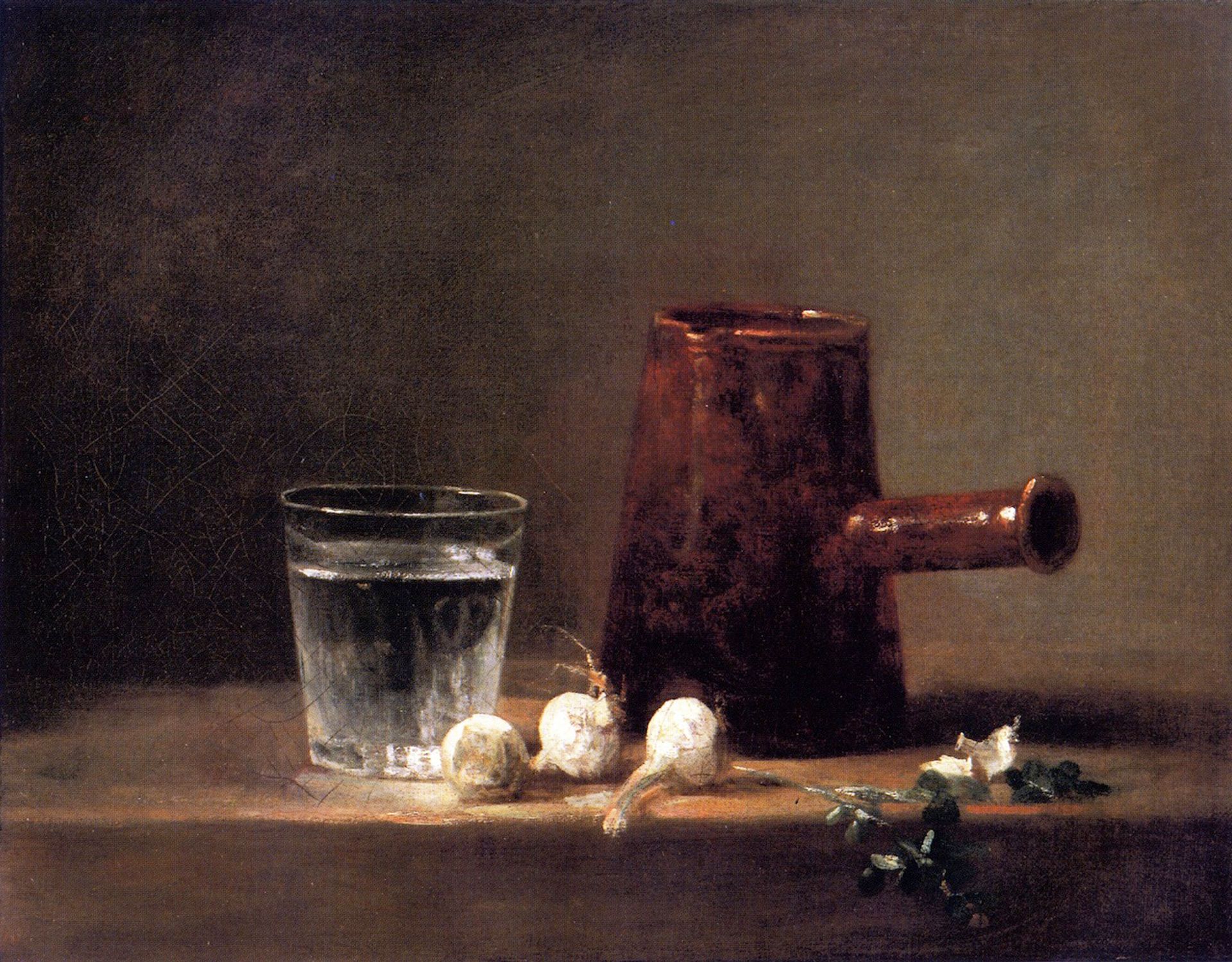 Structured as a series of unrelated physical descriptions of works of art and commentary on their individual histories, the book brings Edmond’s careful attention to discrete objects into sharp relief. His approach is all the more striking as 18th-century art was still underrepresented in public museums. The brothers had therefore charted personal avenues of access. They refined their formidable connoisseurship through study of works owned privately by like-minded collectors such as Louis La Caze, whose major bequest to the Louvre of 1869 included Watteau’s Pierrot (Gilles) (around 1718-19). They were lenders to the landmark exhibition Tableaux et dessins de l’école française, principalement du XVIIIe siècle, tires de collections d’amateurs, organized by the dealer Martinet on the boulevard des Italiens, with a catalogue by their friend, the art critic Philippe Burty. (The latter was, incidentally, to become the owner in around 1874 of Jean-Siméon Chardin’s Glass of Water and Coffeepot from around 1761.)